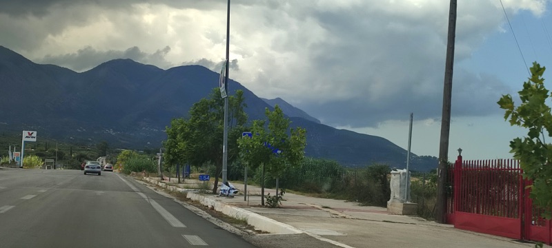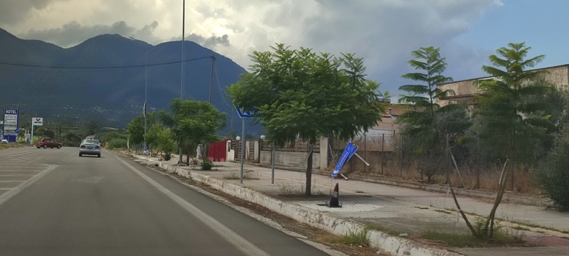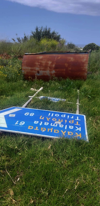 Κάποιες παρεμβάσεις που ξεκίνησαν με έργα φωτισμού εδώ και μήνες δεν έχουν ολοκληρωθεί ακόμη. Αντίθετα, αυτό που αντικρίζει κανείς είναι ταμπέλες ξηλωμένες και παρατημένες στην άκρη, όπως και μια παλιά στάση που αντικαταστάθηκε χωρίς όμως να απομακρυνθεί από το σημείο. Οι πινακίδες που δείχνουν προς Καλαμάτα έχουν ξεθωριάσει και μόλις μετά βίας διακρίνονται. Επίσης κάποιες νέες που μπήκαν για άλλους προορισμούς είναι κρυμμένες πίσω από τα δέντρα.