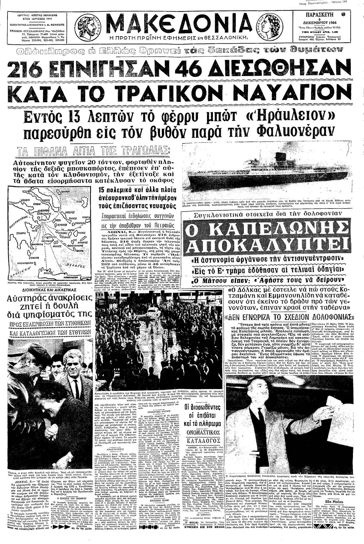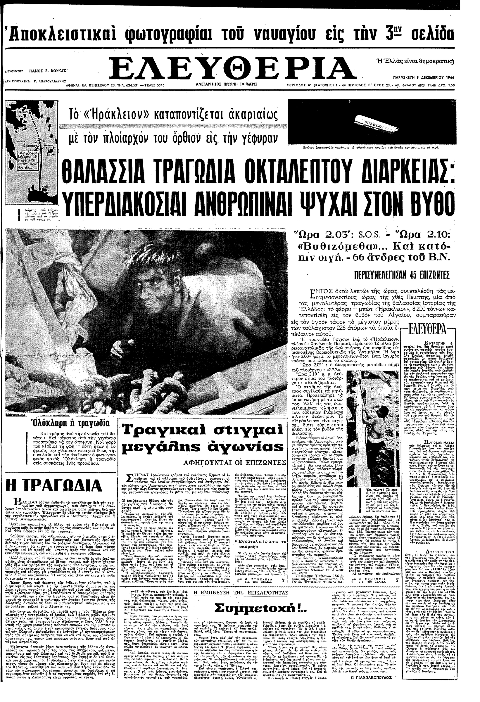“Όπως κλείνεις το ραδιόφωνο, κρακ, έτσι. Εκεί έγινε. Όταν ήμουν επάνω στη σχεδία, το πλοίο είχε χαθεί. Είχε πολύ κόσμο μέσα το πλοίο. Ήταν 250 άτομα που έφυγαν…”, μας λέει ο Καλαματιανός Ηλίας Τριαντάφυλλος, επιζών του ναυαγίου, νεαρός τότε σμηνίτης και μετέπειτα ναυτικός με ειδικότητα ηλεκτρολόγου και μάλιστα στην θαλαμηγό «Χριστίνα» του Ωνάση. Στις 7.20 το βράδυ της 7ης Δεκεμβρίου του 1966 αναχωρεί με το οχηματαγωγό «Ηράκλειον» από το λιμάνι της Σούδας με προορισμό τον Πειραιά, κάτω από κακές καιρικές συνθήκες, με ανέμους κοντά στα 9 Μποφόρ.