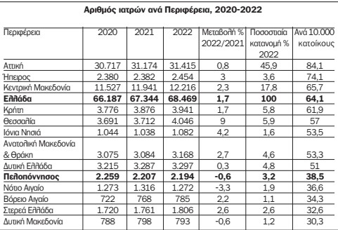 Στην Περιφέρεια Πελοποννήσου αναλογούν 38,5 ιατροί ανά 10.000 κατοίκους ενώ ο μέσος όρος της Ελλάδας είναι 64,1 ιατροί ανά 10.000 κατοίκους. Στην κορυφή της σχετικής κλίμακας βρίσκεται η Αττική με 84,1 ιατρούς ανά 10.000 κάτοικους και στη τελευταία θέση η Δυτική Μακεδονία με 30,3 ιατρούς ανά 10.000 κατοίκους. Αξίζει να σημειωθεί ότι το 2022 σε σχέση με το 2021 στην Περιφέρεια Πελοποννήσου καταγράφηκε πανελληνίως η τρίτη μεγαλύτερη ποσοστιαία μείωση του αριθμού των γιατρών.