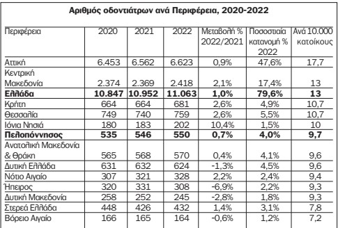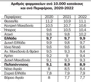 Στην Περιφέρεια Πελοποννήσου 507 φαρμακεία από τα 10.552 της Ελλάδας. Στην Περιφέρεια Πελοποννήσου αναλογούν 8,9 φαρμακεία ανά 10.000 κατοίκους ενώ ο μέσος όρος της Ελλάδας είναι 9,9 φαρμακεία ανά 10.000 κατοίκους. Στην κορυφή της σχετικής κλίμακας βρίσκεται η Θεσσαλία με 11,1 φαρμακεία ανά 10.000 κάτοικους και στην τελευταία θέση το Βόρειο Αιγαίο με 7,7 φαρμακεία ανά 10.000 κατοίκους.