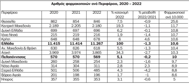Αναφορικά με τον αριθμό των φαρμακοποιών, σύμφωνα με στοιχεία του Πανελλήνιου Φαρμακευτικού Συλλόγου, ο αριθμός των φαρμακοποιών που εργάστηκαν σε φαρμακεία το έτος 2022 ανήλθε σε 11.267 έναντι 11.414 το έτος 2021