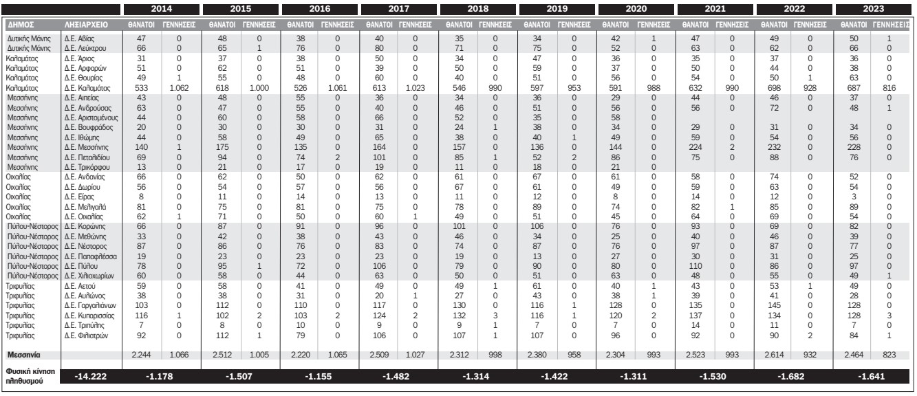 Αναλυτικά στοιχεία για τους θανάτους και τις γεννήσεις που καταγράφηκαν στα ληξιαρχεία της Μεσσηνίας την τελευταία δεκαετία παρουσιάζονται στον πίνακα:
