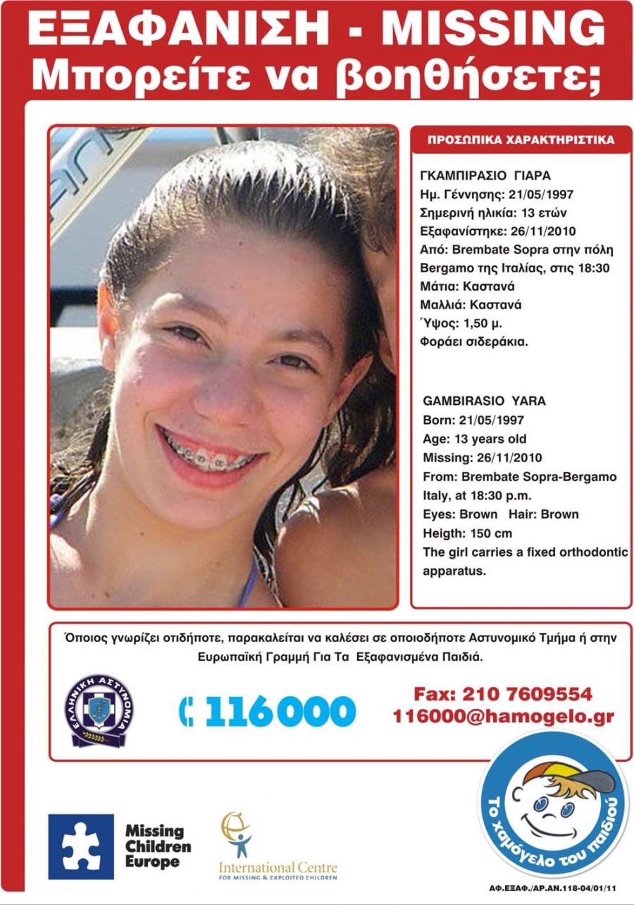 Στις 26 Νοεμβρίου 2010 το απόγευμα εξαφανίστηκε η 13 ετών Γιάρα από την περιοχή Brembate Sopra στην πόλη Bergamo της Ιταλίας όπου και διαμένει. Η Γιάρα έχει καστανά μαλλιά, καστανά μάτια, το ύψος της είναι 1,50 μ. και φοράει σιδεράκια.