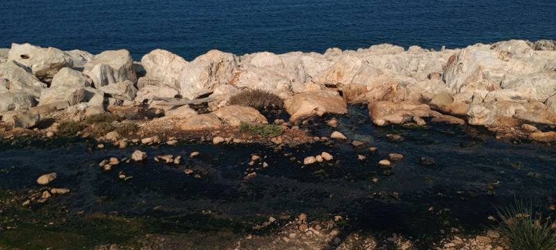 Ο αγροτικός δρόμος που οδηγεί προς τη θάλασσα, προς την πλευρά του Ιονίου, είναι γεμάτος λύματα, ενώ τα λύματα έχουν σχηματίσει και λίμνες στα βράχια της ακτής.