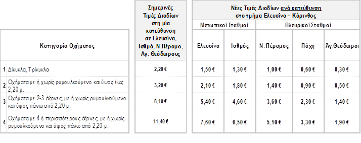 Η χρέωση στα μετωπικά διόδια Ελευσίνας και Ισθμού θα γίνεται πλέον και στις δύο κατευθύνσεις, με νέες τιμές όπως φαίνεται στον παρακάτω πίνακα.