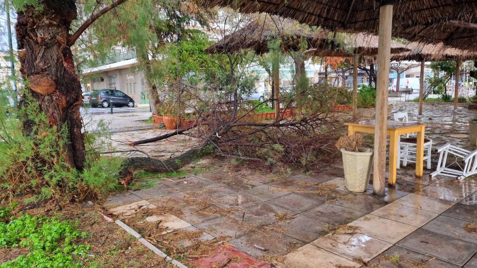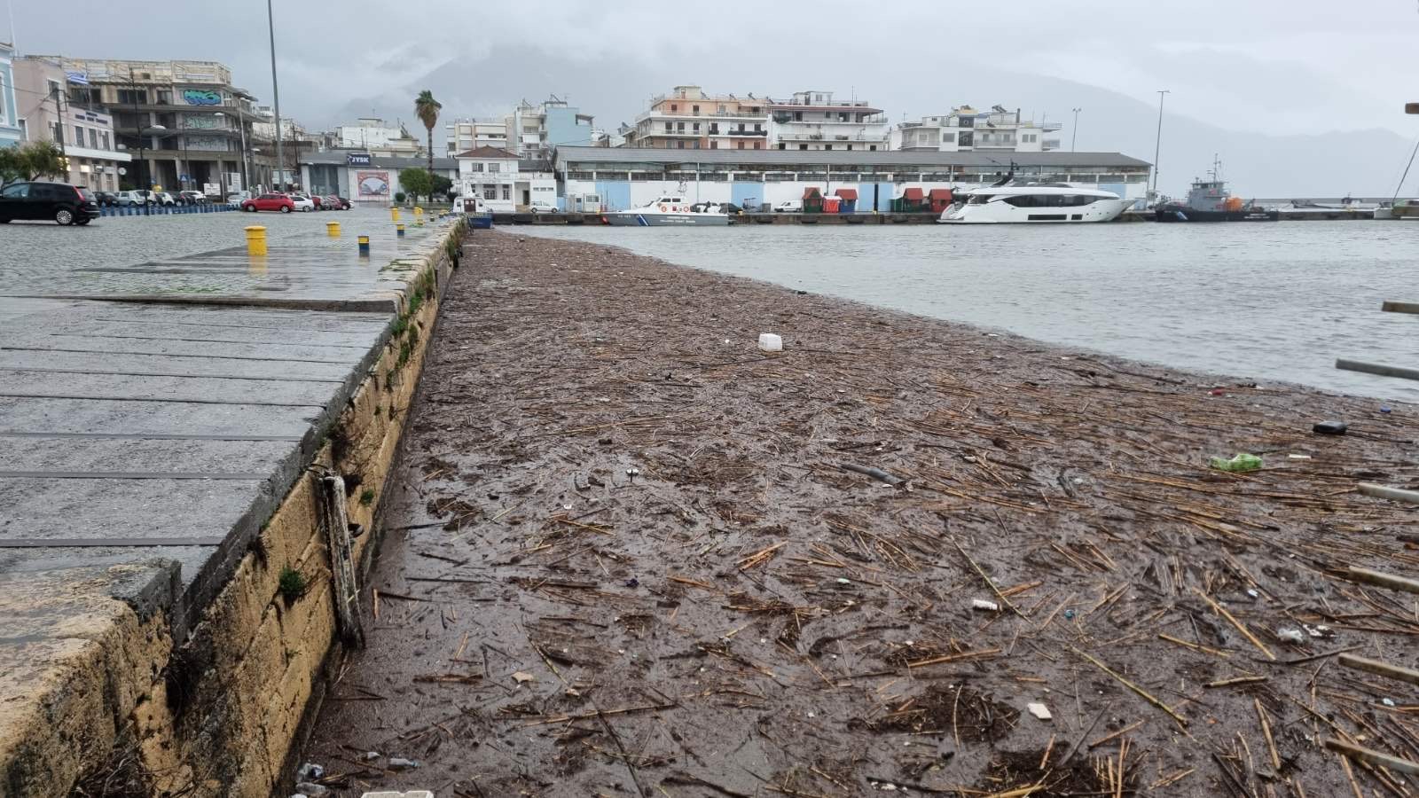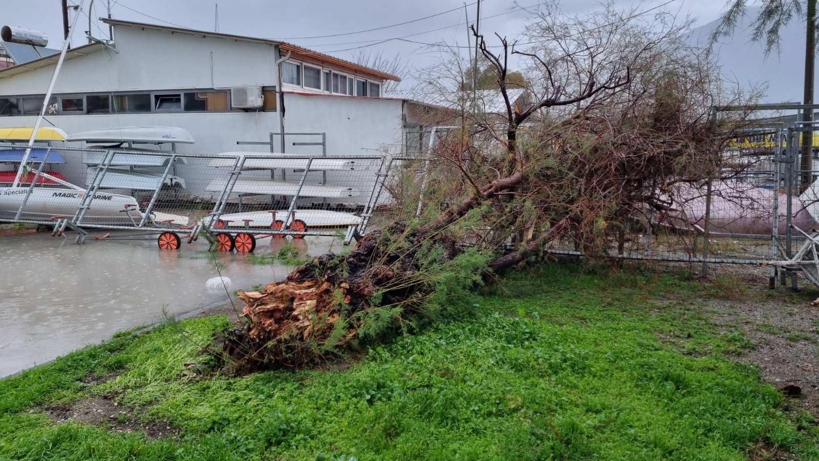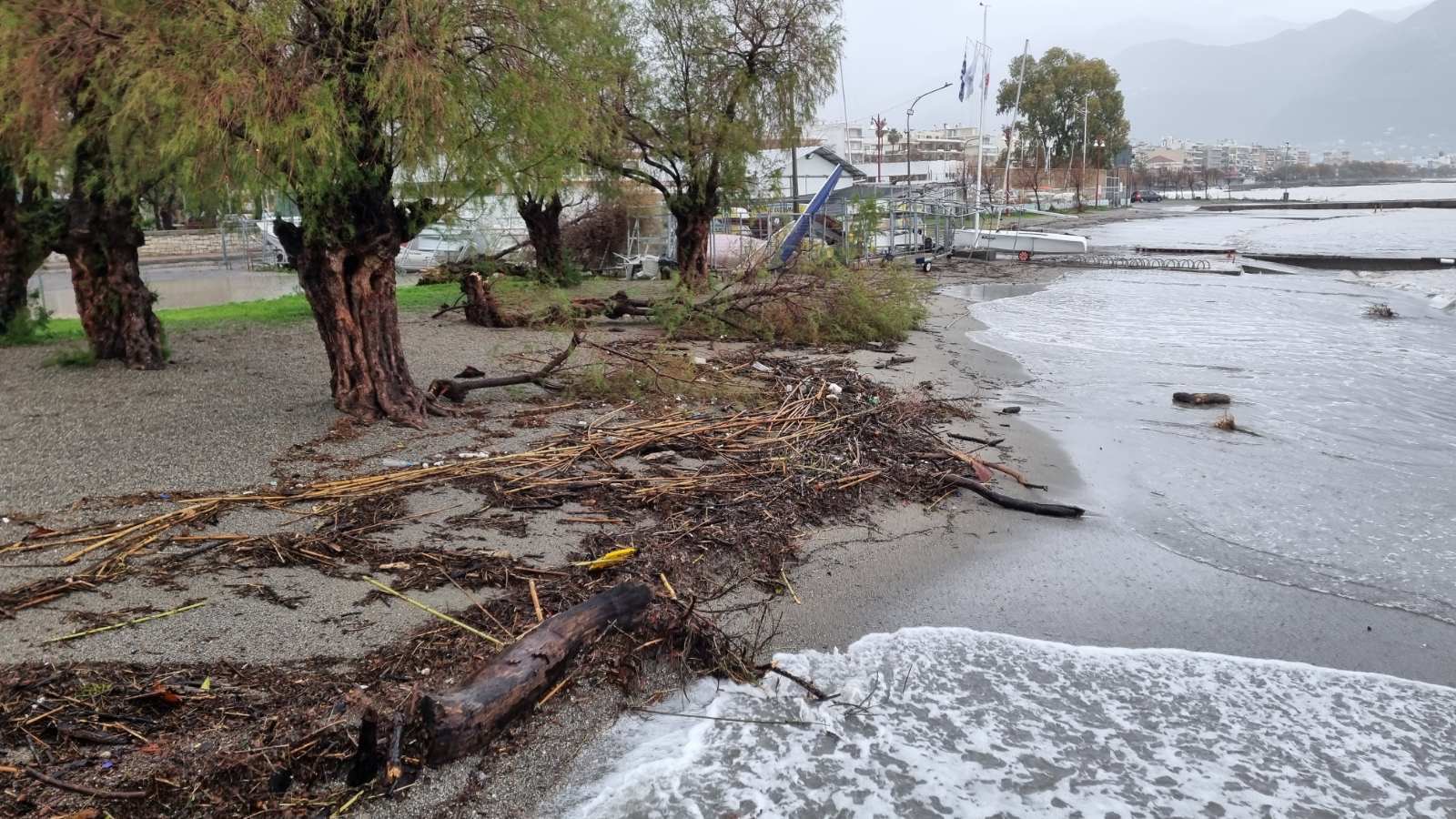 Δέντρα ξεριζώθηκαν, εξοπλισμοί καταστημάτων παρασύρθηκαν, ενώ αρκετές βάρκες στο λιμάνι της Καλαμάτας έχουν βουλιάξει.