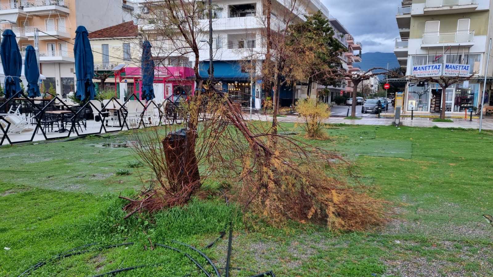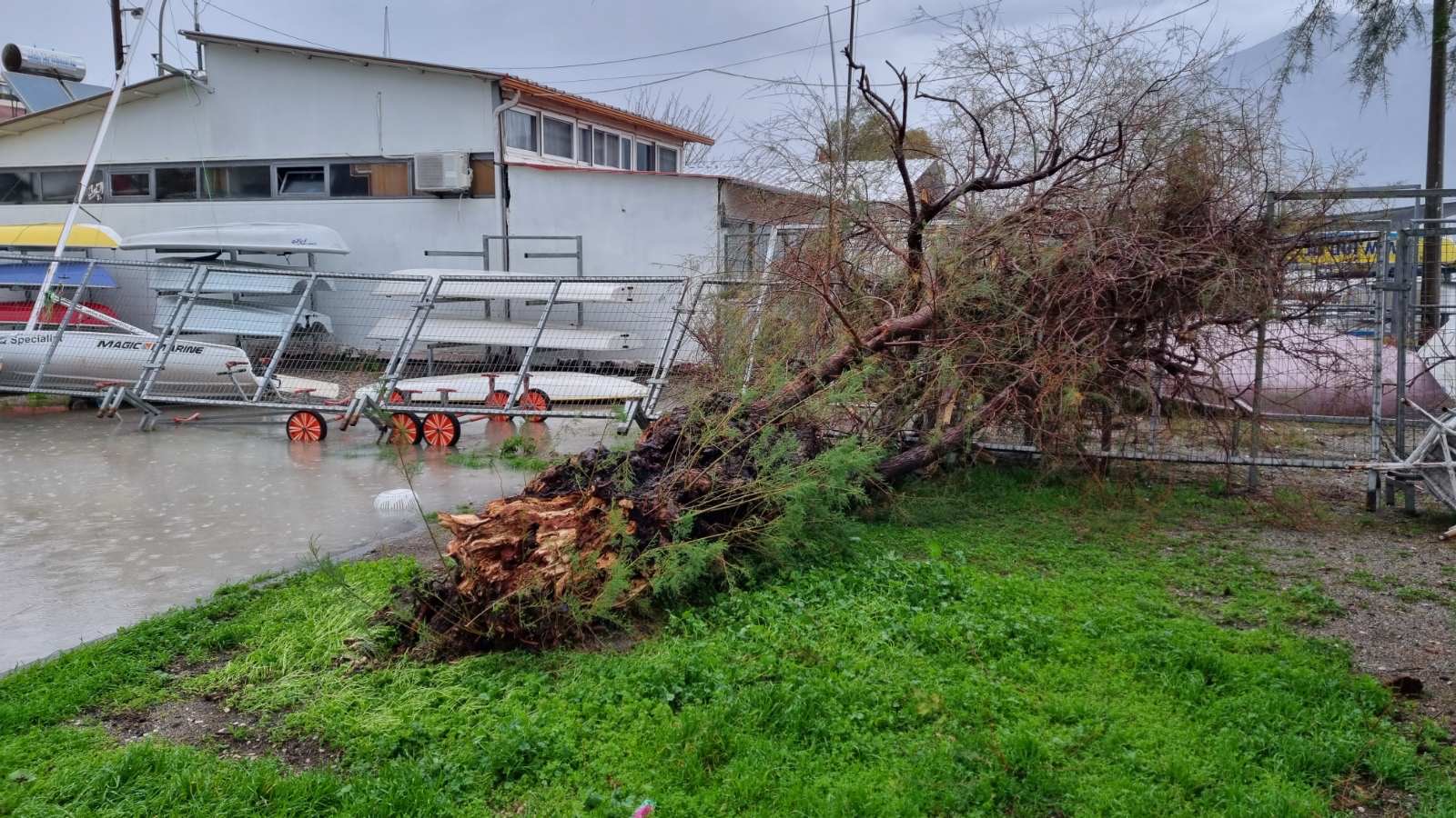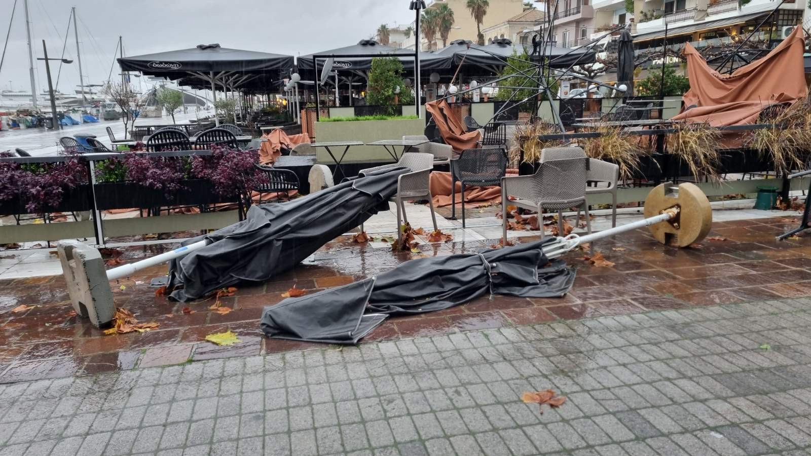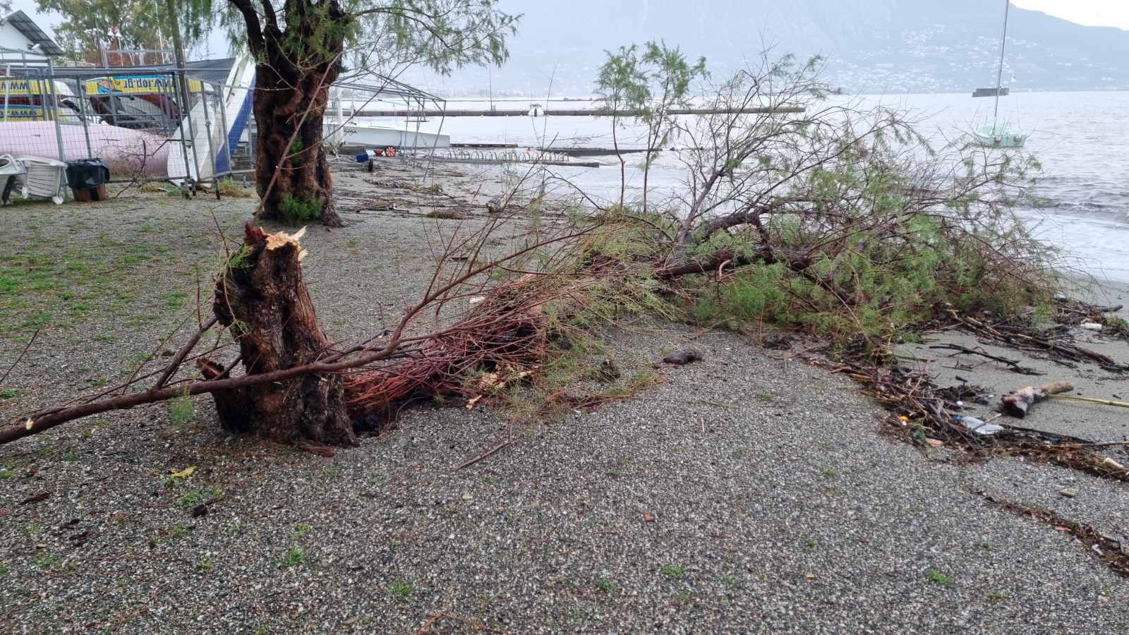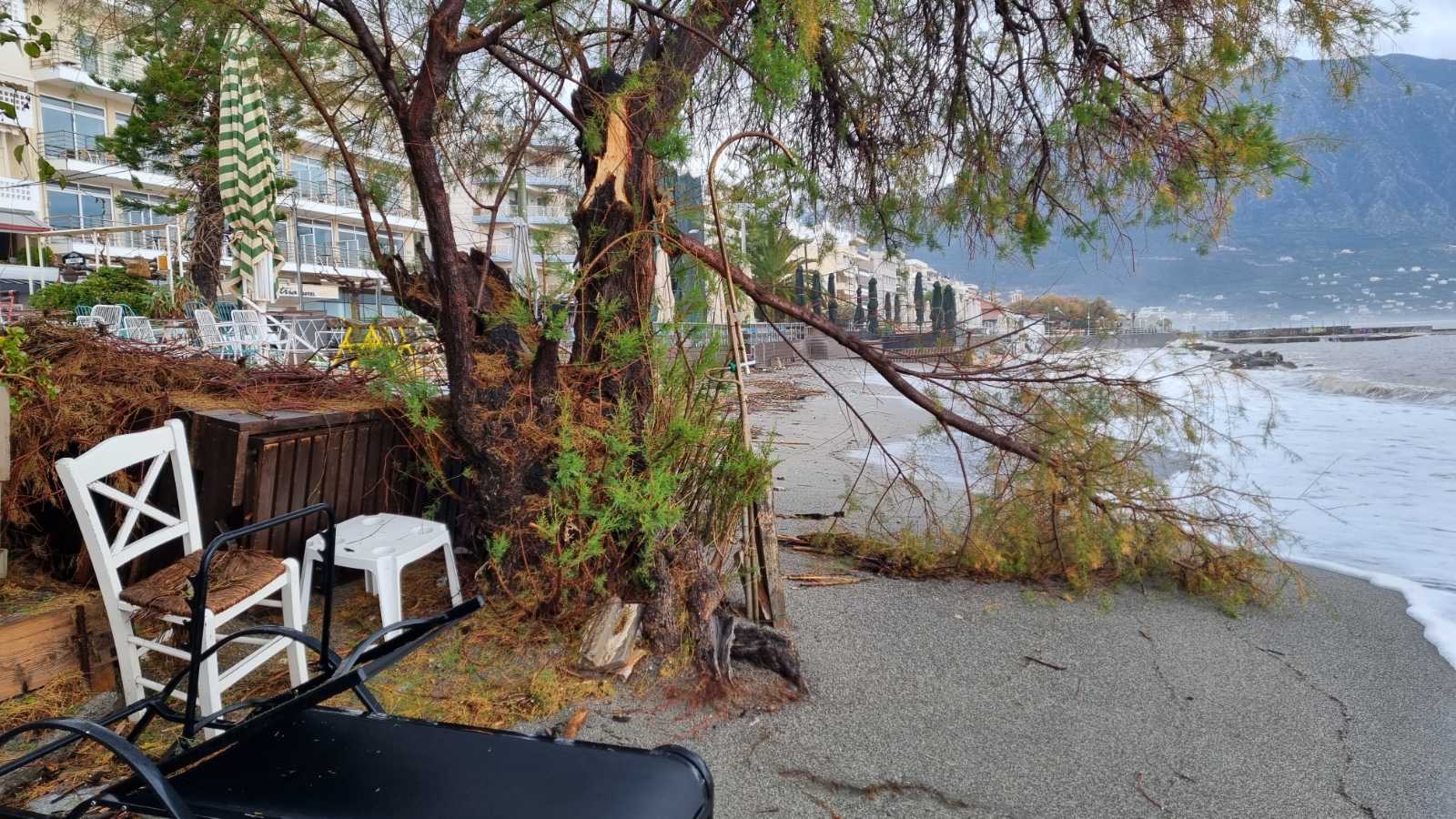 Δέντρα ξεριζώθηκαν, εξοπλισμοί καταστημάτων παρασύρθηκαν, ενώ αρκετές βάρκες στο λιμάνι της Καλαμάτας έχουν βουλιάξει.