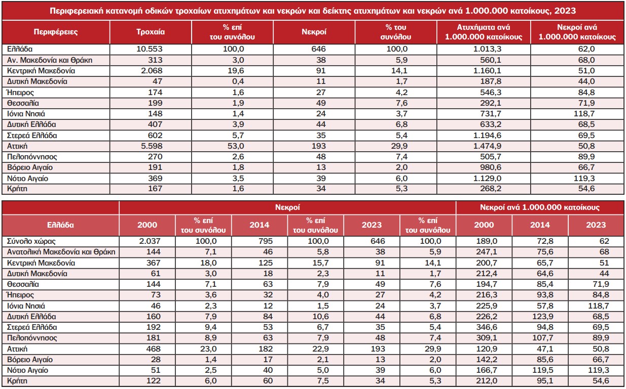 Κατά το έτος 2023, συνέβησαν σε ολόκληρη την Ελλάδα ώρα 10.553 οδικά τροχαία ατυχήματα, τα οποία προκάλεσαν το θάνατο ή τον τραυματισμό ατόμων, παρουσιάζοντας αύξηση κατά 0,6% σε σύγκριση με το 2022 κατά το οποίο είχαν συμβεί 10.487 ατυχήματα . Ο συνολικός αριθμός των παθόντων στα οδικά τροχαία ατυχήματα για το έτος 2023 παρουσίασε αύξηση κατά 1,4% σε σύγκριση με το 2022 (13.461 το 2023 έναντι 13.279 το 2022). Αναλυτικότερα, από τα παθόντα πρόσωπα των οδικών τροχαίων ατυχημάτων το 2023, καταγράφηκαν 646 νεκροί, 659 βαριά τραυματίες και 12.156 ελαφρά τραυματίες, έναντι 654 νεκρών, 664 βαριά τραυματιών και 11.961 ελαφρά τραυματιών το 2022, παρουσιάζοντας μείωση κατά 1,2% σε νεκρούς και 0,8% σε βαριά τραυματίες και αύξηση 1,6% σε ελαφρά τραυματίες.