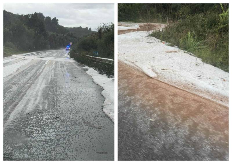 Το χαλάζι κάλυψε τα πάντα ενώ η εθνική οδός πλημμύρισε από νερά και φερτά υλικά που κατέληξαν εκεί από παραδρόμους.