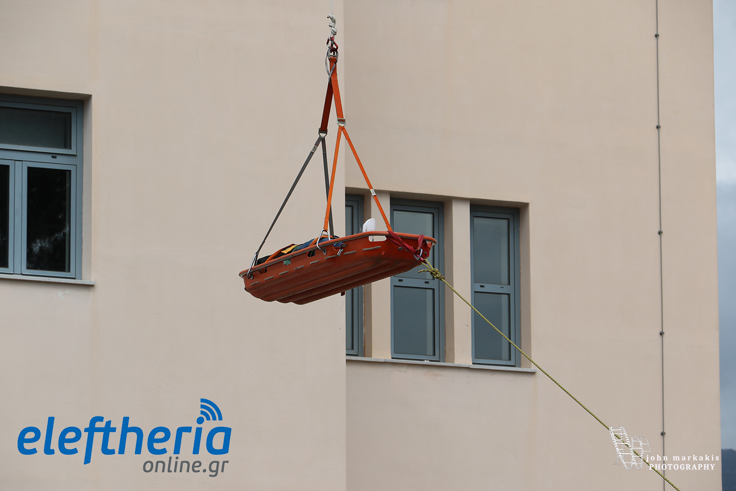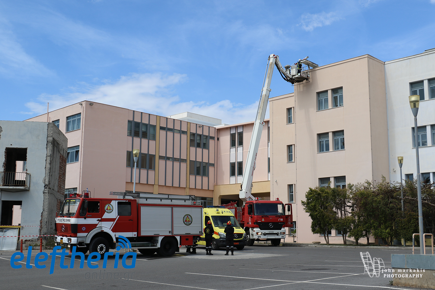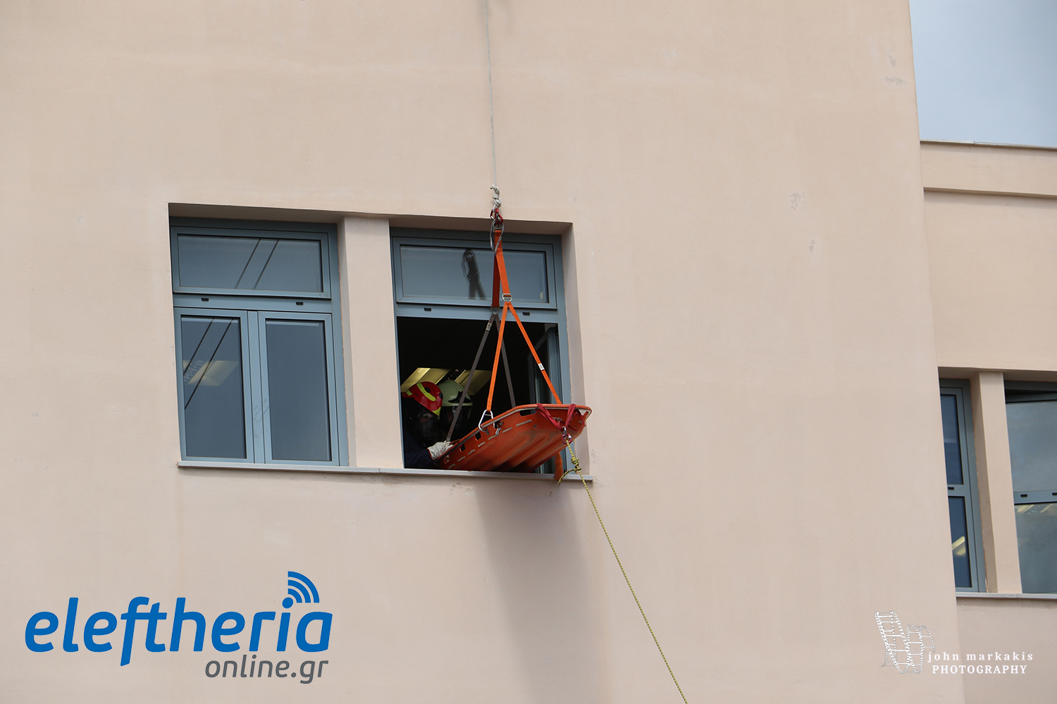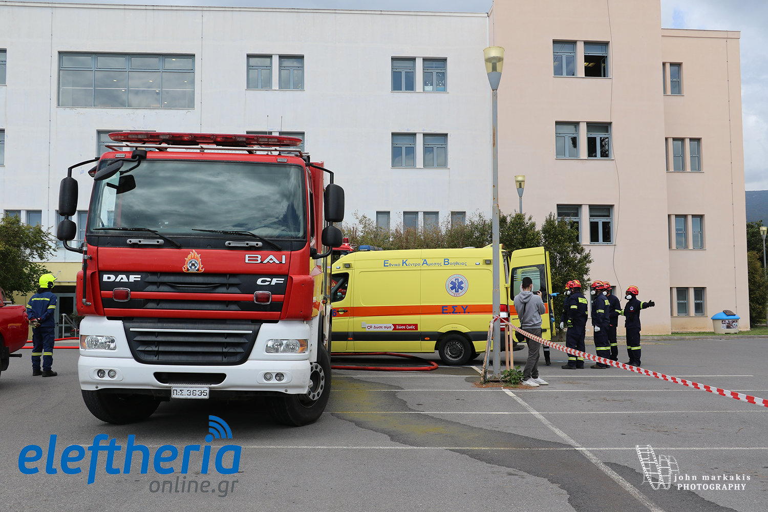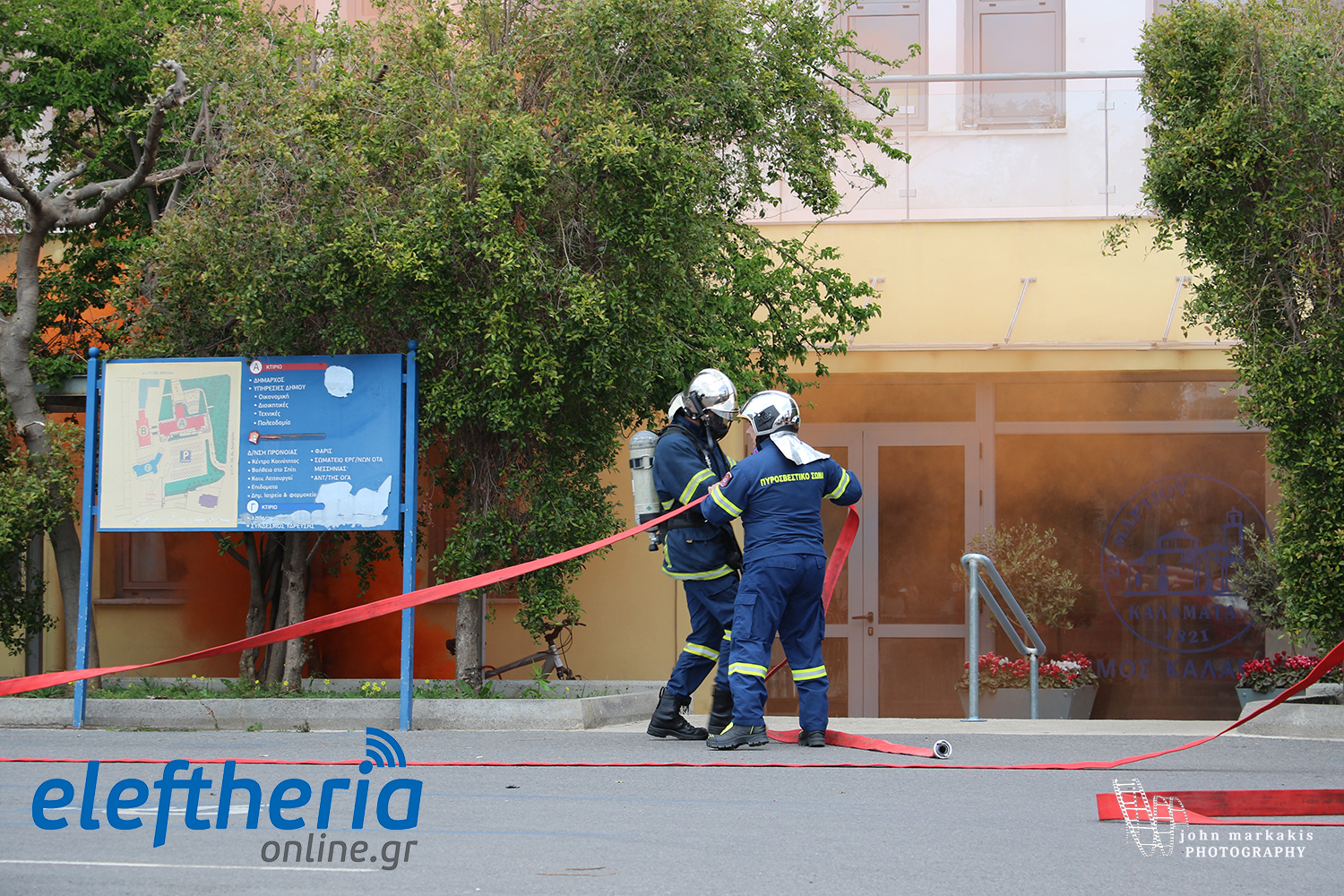 Κατά τη διάρκεια λειτουργίας του Δημαρχείου Καλαμάτας, εκδηλώνεται πυρκαγιά από βραχυκύκλωμα στην καμπίνα δομημένης καλωδίωσης (RACKS) στο ισόγειο. Από την πυρκαγιά υφίσταται μεγάλος κίνδυνος επέκτασης στον ευρύτερο ενιαίο χώρο του ισογείου και κατ’ επέκταση στο σύνολο του κτηρίου. Το σύστημα πυρανίχνευσης ενεργοποιείται, ο υπεύθυνος της ομάδας πυρασφάλειας του Δημαρχείου αντιλαμβάνεται το συμβάν πυρκαγιάς και ειδοποιεί την Π.Υ. Καλαμάτας. Η ομάδα πυρασφάλειας προσπαθεί να κατασβήσει την πυρκαγιά με τα φορητά μέσα ενεργητικής πυροπροστασίας, κάτι το οποίο δεν κατέστη εφικτό. Η πυρκαγιά εξαπλώθηκε με γρήγορο ρυθμό λόγω των εύφλεκτων υλικών σε βιβλιοθήκη με έντυπο αρχείο στο ισόγειο. Κατά την άφιξη της Πυροσβεστικής εξόδου, η ομάδα καταστολής – επέμβασης, αναπτύσσοντας πυροσβεστικές εγκαταστάσεις ύδατος με σωλήνες διαμέτρου 45 χιλ., προσεγγίζει, κατασβήνει την πυρκαγιά και ταυτοχρόνως απεγκλωβίζει και απομακρύνει σε υπαίθριο ασφαλή χώρο, εγκλωβισμένους εργαζόμενους. Παράλληλα, απεγκλωβίζει και ένα (01) άτομο από τον ανελκυστήρα του κτηρίου λόγω της διακοπής του ρεύματος. Στην προσπάθεια κατάσβεσης της πυρκαγιάς τραυματίζεται ένα (01) μέλος από την ομάδα πυροπροστασίας του κτηρίου, φέροντας εγκαύματα στα χέρια και στα πόδια. Το άτομο, στην συνέχεια για να διαφύγει από την πυρκαγιά και τους πυκνούς καπνούς, καταλήγει στον 3 ο επίπεδο του κτηρίου, στην νοτιοανατολική πλευρά, πλησίον παραθύρου. Οι πρώτοι διασώστες καταφέρνουν να το προσεγγίσουν από το κλιμακοστάσιο μεταφέροντας και φορείο, καλούν ενίσχυση. Όμως, αναφέρουν ότι η διάσωση του από το κλιμακοστάσιο είναι πλέον αδύνατη λόγω πυκνών καπνών. Αποφασίζεται ότι η διάσωση θα πραγματοποιηθεί με χρήση φορείου τύπου καλαθίου και διασωστικών κάλων σε διάταξη κεκλιμένης τραβέρσας από την ταράτσα έως το έδαφος, προκειμένου να γίνει η κατάβαση του ατόμου στον νοτιοανατολικό αύλειο χώρο του Δημαρχείου. Οι διασώστες που βρίσκονται εξωτερικά του κτηρίου προσεγγίζουν από την νοτιοανατολική πλευρά, παραλαμβάνουν το τραυματισμένο άτομο που μεταφέρεται σε ασφαλή χώρο και του παρέχονται οι πρώτες βοήθειες έπειτα διακομίζεται με ασθενοφόρο στην Μονάδα Εκτάκτων Περιστατικών της Ν.Μ. Καλαμάτας, Γ.Ν. Μεσσηνίας. Ένα ακόμη άτομο από τους πολίτες τραυματίζεται, φέροντας εγκαύματα στα χέρια και κτυπώντας το γόνατο και τον αγκώνα του, ανεβαίνοντας την εσωτερική κλίμακα αποπροσανατολίζεται από τους καπνούς, καταφεύγει στο δυτικό μέρος του εξωτερικού εξώστη (ταράτσα), στα νότια. Κινδυνεύει από φλόγες και καπνό. Αναφέρεται ότι δεν μπορεί να προσεγγιστεί και χρειάζονται ενίσχυση. Το άτομο κινδυνεύει. Αποφασίζεται η διάσωση να πραγματοποιηθεί με την συνδρομή του βραχιονοφόρου ειδικού οχήματος, με βραχίονα μήκους 22 μέτρων. Οι διασώστες προσεγγίζουν το άτομο και παράλληλα πραγματοποιούν βολή ύδατος από τον σταθερό αυλό του καλαθίου, δημιουργώντας υδάτινη κουρτίνα για προστασία του κινδυνεύοντος ατόμου. Παραλαμβάνουν με την χρήση φορείου και ειδικής βάσης στον βραχίονα του οχήματος το κινδυνεύον άτομο. Εν συνεχεία κατεβάζουν το τραυματισμένο άτομο στο νότιο αύλειο χώρο του Δημαρχείου, μεταφέρεται σε ασφαλή χώρο, του παρέχονται οι πρώτες βοήθειες και διακομίζεται με ασθενοφόρο στην Μονάδα Εκτάκτων Περιστατικών της Ν.Μ. Καλαμάτας, Γ.Ν. Μεσσηνίας. Έπειτα πραγματοποιούν πάλι βολή ύδατος από τ