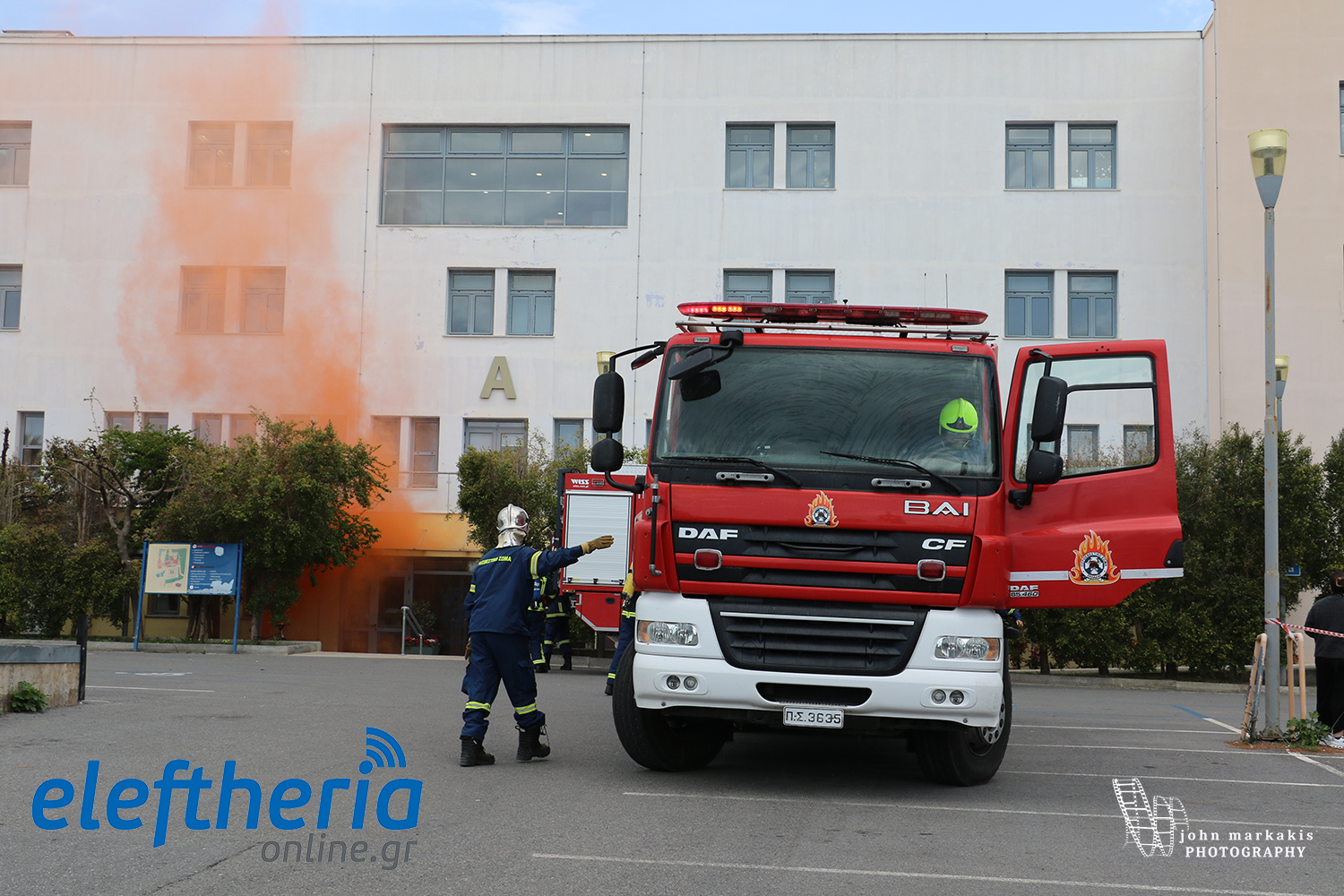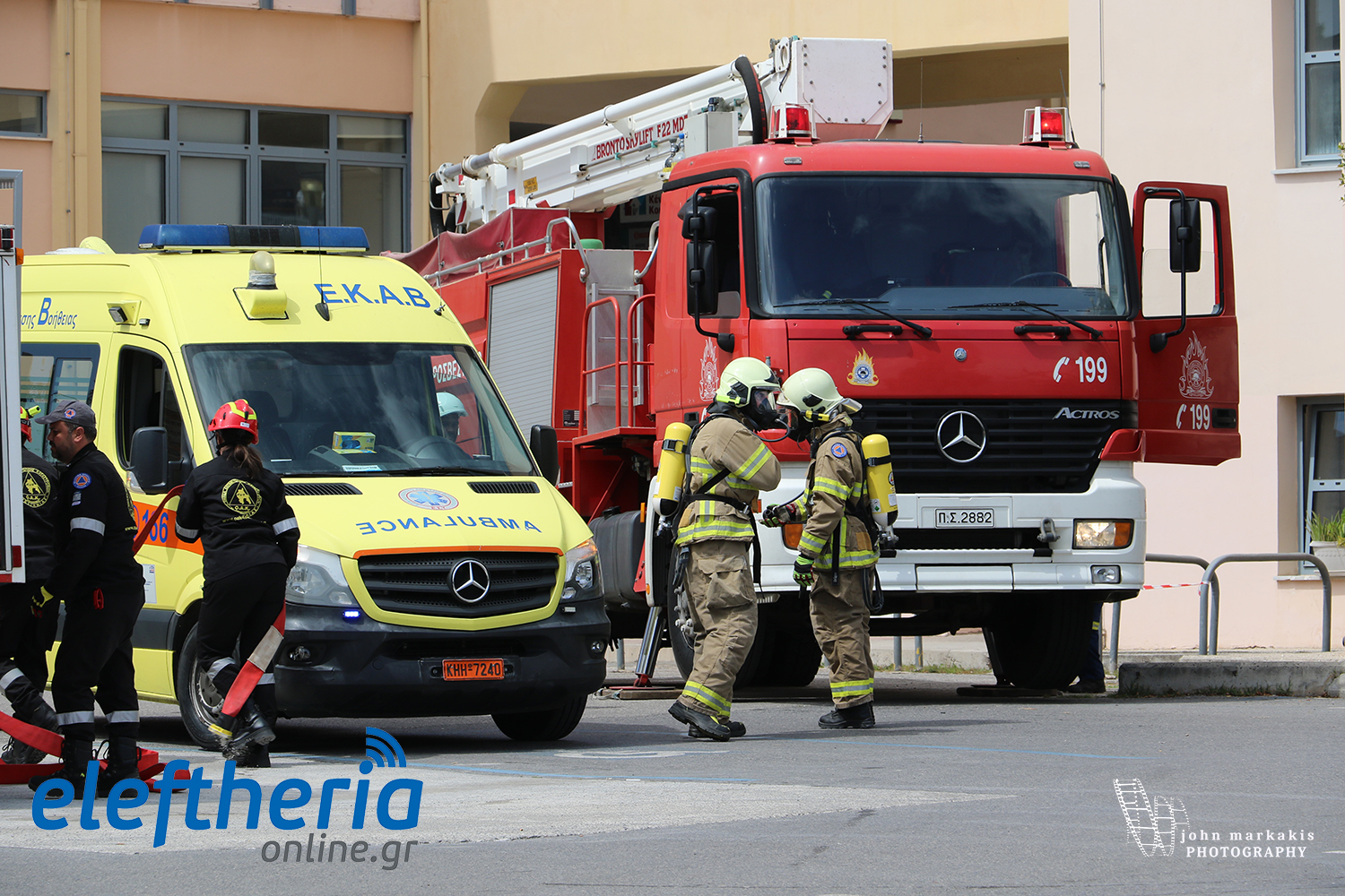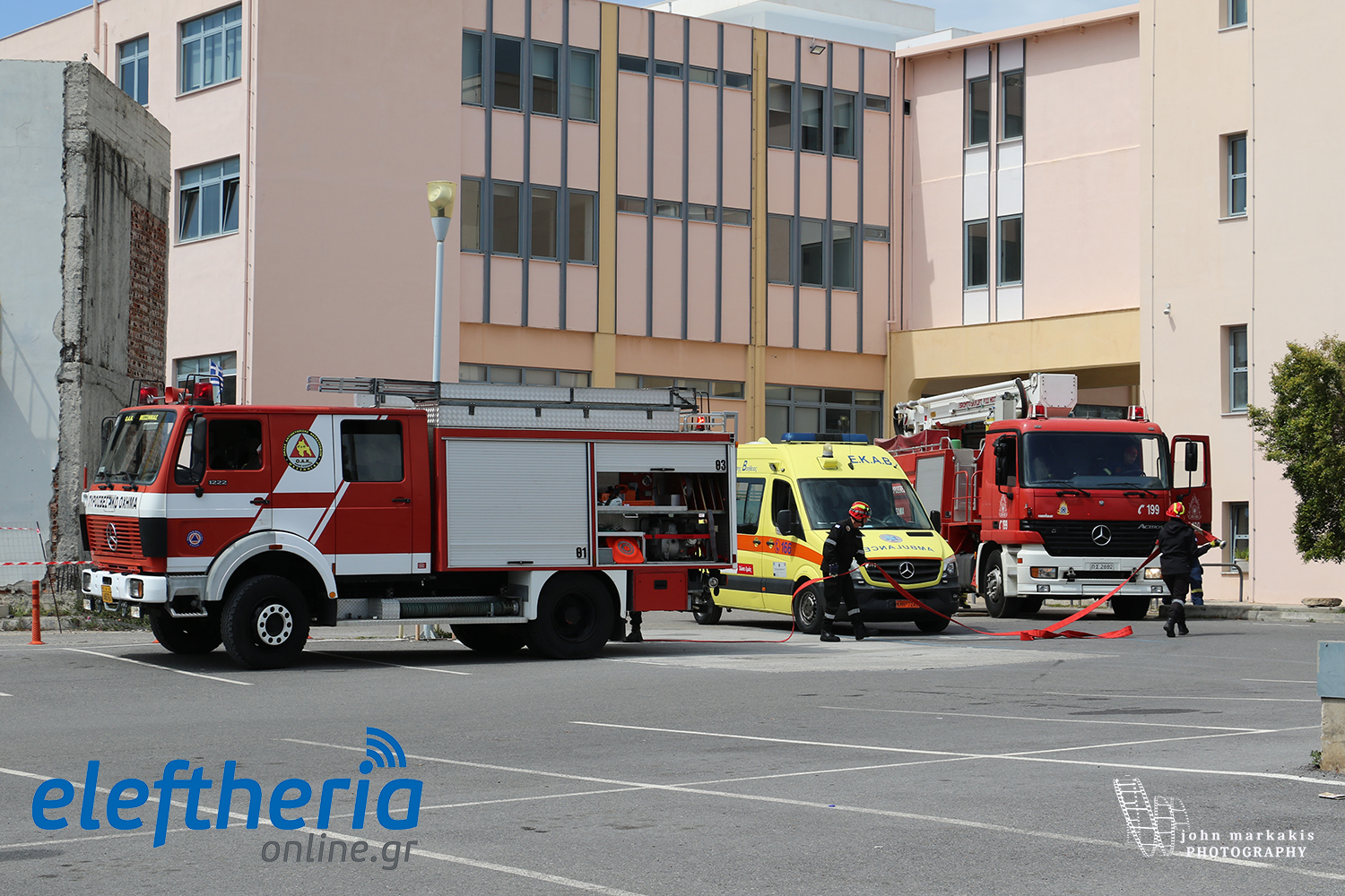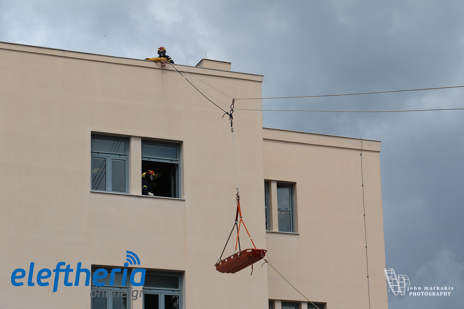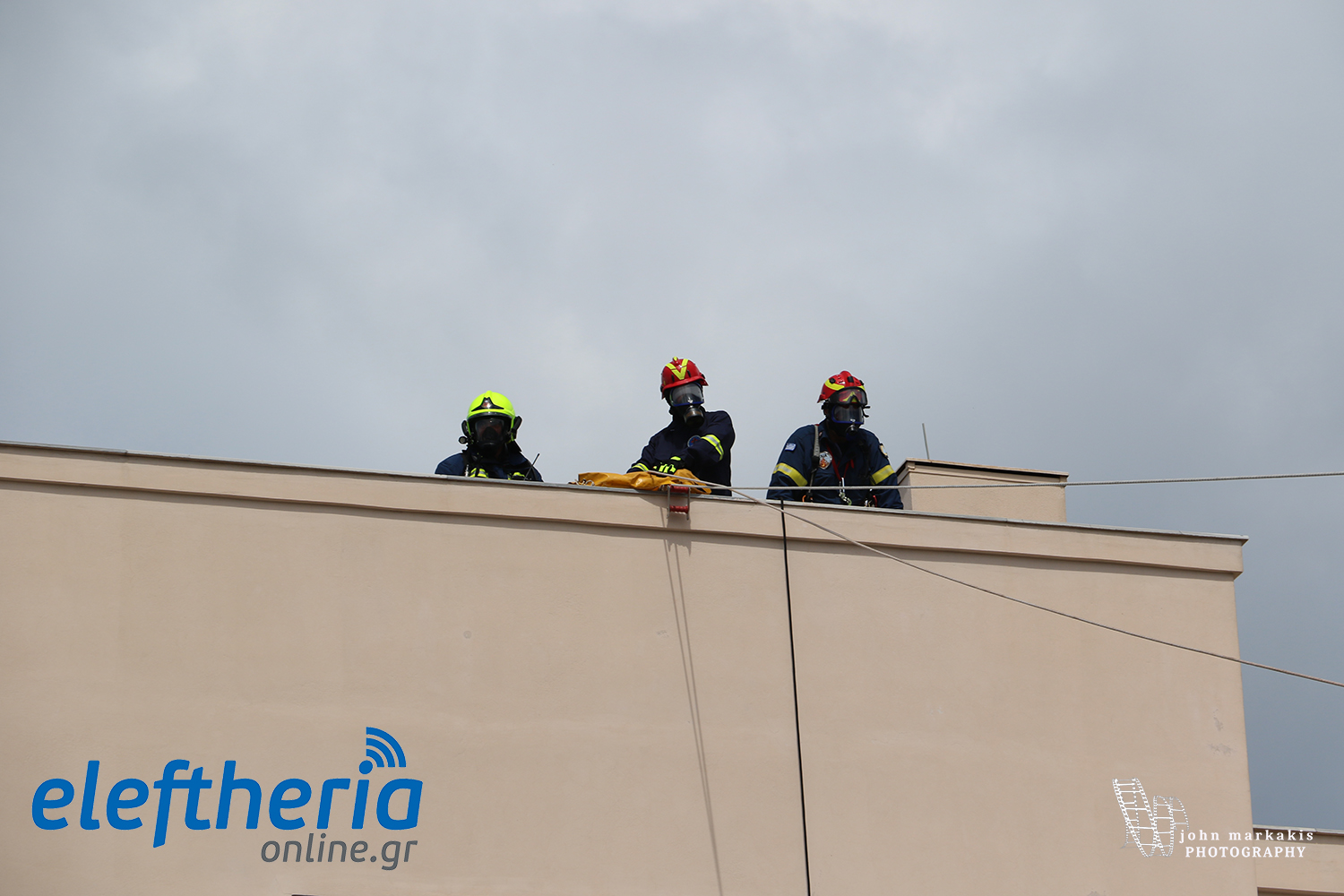 Κατά τη διάρκεια λειτουργίας του Δημαρχείου Καλαμάτας, εκδηλώνεται πυρκαγιά από βραχυκύκλωμα στην καμπίνα δομημένης καλωδίωσης (RACKS) στο ισόγειο. Από την πυρκαγιά υφίσταται μεγάλος κίνδυνος επέκτασης στον ευρύτερο ενιαίο χώρο του ισογείου και κατ’ επέκταση στο σύνολο του κτηρίου. Το σύστημα πυρανίχνευσης ενεργοποιείται, ο υπεύθυνος της ομάδας πυρασφάλειας του Δημαρχείου αντιλαμβάνεται το συμβάν πυρκαγιάς και ειδοποιεί την Π.Υ. Καλαμάτας. Η ομάδα πυρασφάλειας προσπαθεί να κατασβήσει την πυρκαγιά με τα φορητά μέσα ενεργητικής πυροπροστασίας, κάτι το οποίο δεν κατέστη εφικτό. Η πυρκαγιά εξαπλώθηκε με γρήγορο ρυθμό λόγω των εύφλεκτων υλικών σε βιβλιοθήκη με έντυπο αρχείο στο ισόγειο. Κατά την άφιξη της Πυροσβεστικής εξόδου, η ομάδα καταστολής – επέμβασης, αναπτύσσοντας πυροσβεστικές εγκαταστάσεις ύδατος με σωλήνες διαμέτρου 45 χιλ., προσεγγίζει, κατασβήνει την πυρκαγιά και ταυτοχρόνως απεγκλωβίζει και απομακρύνει σε υπαίθριο ασφαλή χώρο, εγκλωβισμένους εργαζόμενους. Παράλληλα, απεγκλωβίζει και ένα (01) άτομο από τον ανελκυστήρα του κτηρίου λόγω της διακοπής του ρεύματος. Στην προσπάθεια κατάσβεσης της πυρκαγιάς τραυματίζεται ένα (01) μέλος από την ομάδα πυροπροστασίας του κτηρίου, φέροντας εγκαύματα στα χέρια και στα πόδια. Το άτομο, στην συνέχεια για να διαφύγει από την πυρκαγιά και τους πυκνούς καπνούς, καταλήγει στον 3 ο επίπεδο του κτηρίου, στην νοτιοανατολική πλευρά, πλησίον παραθύρου. Οι πρώτοι διασώστες καταφέρνουν να το προσεγγίσουν από το κλιμακοστάσιο μεταφέροντας και φορείο, καλούν ενίσχυση. Όμως, αναφέρουν ότι η διάσωση του από το κλιμακοστάσιο είναι πλέον αδύνατη λόγω πυκνών καπνών. Αποφασίζεται ότι η διάσωση θα πραγματοποιηθεί με χρήση φορείου τύπου καλαθίου και διασωστικών κάλων σε διάταξη κεκλιμένης τραβέρσας από την ταράτσα έως το έδαφος, προκειμένου να γίνει η κατάβαση του ατόμου στον νοτιοανατολικό αύλειο χώρο του Δημαρχείου. Οι διασώστες που βρίσκονται εξωτερικά του κτηρίου προσεγγίζουν από την νοτιοανατολική πλευρά, παραλαμβάνουν το τραυματισμένο άτομο που μεταφέρεται σε ασφαλή χώρο και του παρέχονται οι πρώτες βοήθειες έπειτα διακομίζεται με ασθενοφόρο στην Μονάδα Εκτάκτων Περιστατικών της Ν.Μ. Καλαμάτας, Γ.Ν. Μεσσηνίας. Ένα ακόμη άτομο από τους πολίτες τραυματίζεται, φέροντας εγκαύματα στα χέρια και κτυπώντας το γόνατο και τον αγκώνα του, ανεβαίνοντας την εσωτερική κλίμακα αποπροσανατολίζεται από τους καπνούς, καταφεύγει στο δυτικό μέρος του εξωτερικού εξώστη (ταράτσα), στα νότια. Κινδυνεύει από φλόγες και καπνό. Αναφέρεται ότι δεν μπορεί να προσεγγιστεί και χρειάζονται ενίσχυση. Το άτομο κινδυνεύει. Αποφασίζεται η διάσωση να πραγματοποιηθεί με την συνδρομή του βραχιονοφόρου ειδικού οχήματος, με βραχίονα μήκους 22 μέτρων. Οι διασώστες προσεγγίζουν το άτομο και παράλληλα πραγματοποιούν βολή ύδατος από τον σταθερό αυλό του καλαθίου, δημιουργώντας υδάτινη κουρτίνα για προστασία του κινδυνεύοντος ατόμου. Παραλαμβάνουν με την χρήση φορείου και ειδικής βάσης στον βραχίονα του οχήματος το κινδυνεύον άτομο. Εν συνεχεία κατεβάζουν το τραυματισμένο άτομο στο νότιο αύλειο χώρο του Δημαρχείου, μεταφέρεται σε ασφαλή χώρο, του παρέχονται οι πρώτες βοήθειες και διακομίζεται με ασθενοφόρο στην Μονάδα Εκτάκτων Περιστατικών της Ν.Μ. Καλαμάτας, Γ.Ν. Μεσσηνίας. Έπειτα πραγματοποιούν πάλι βολή ύδατος από τ