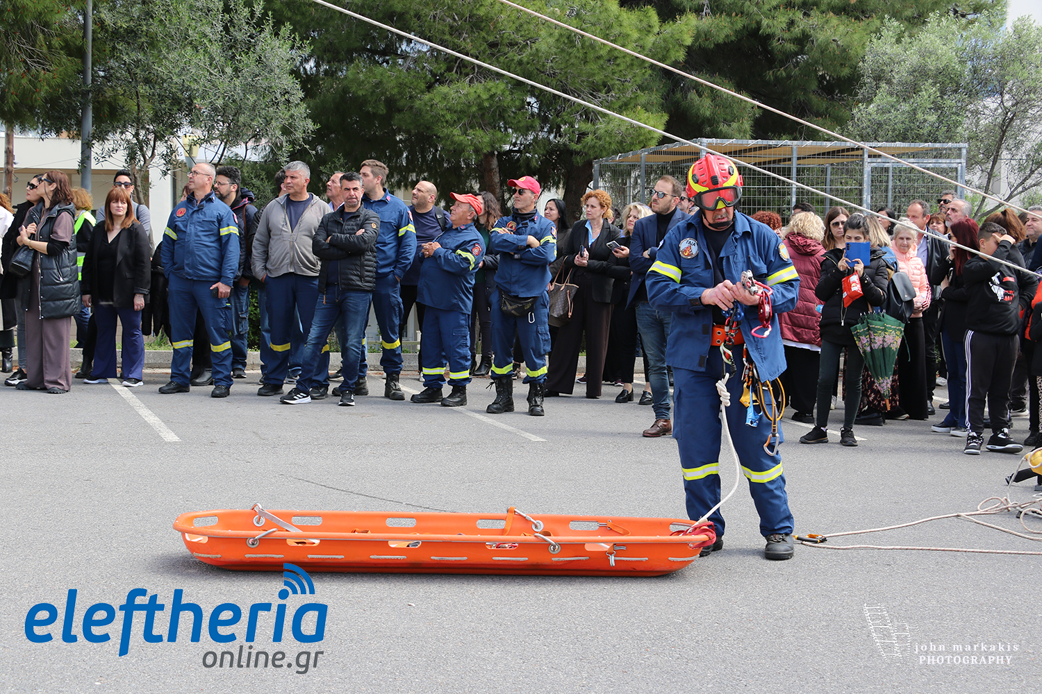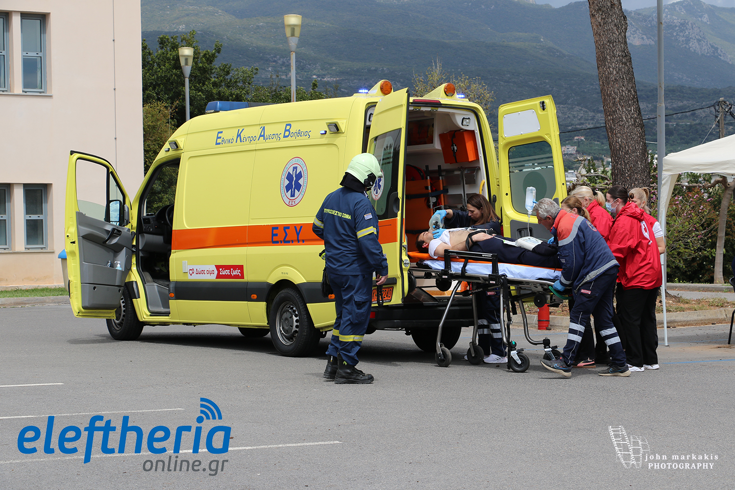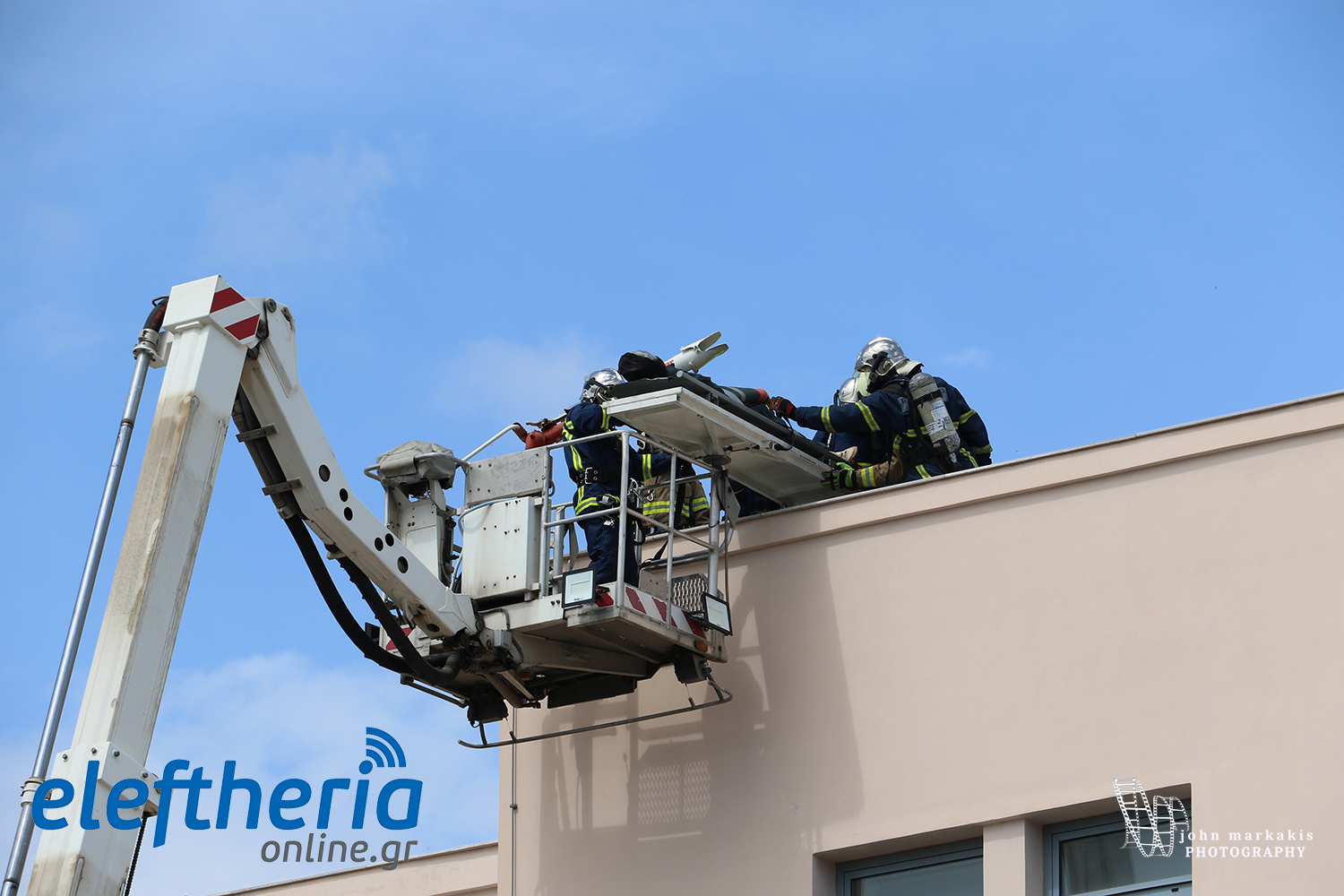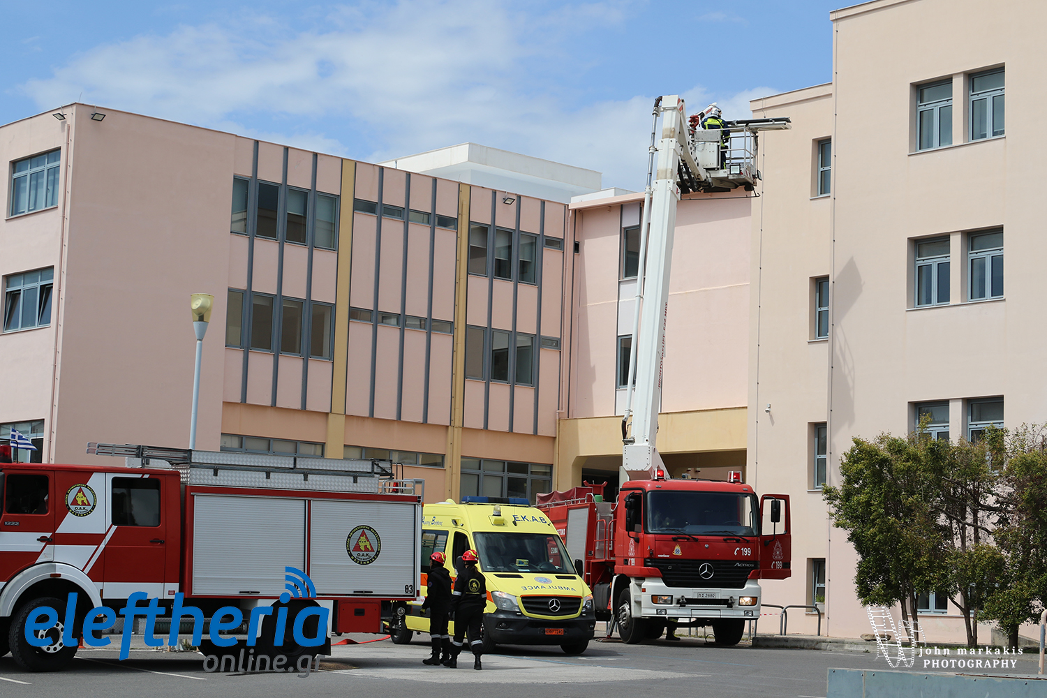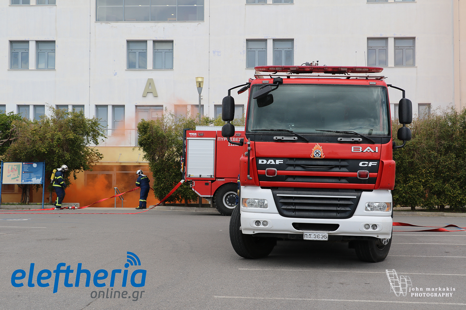Κατά τη διάρκεια λειτουργίας του Δημαρχείου Καλαμάτας, εκδηλώνεται πυρκαγιά από βραχυκύκλωμα στην καμπίνα δομημένης καλωδίωσης (RACKS) στο ισόγειο. Από την πυρκαγιά υφίσταται μεγάλος κίνδυνος επέκτασης στον ευρύτερο ενιαίο χώρο του ισογείου και κατ’ επέκταση στο σύνολο του κτηρίου. Το σύστημα πυρανίχνευσης ενεργοποιείται, ο υπεύθυνος της ομάδας πυρασφάλειας του Δημαρχείου αντιλαμβάνεται το συμβάν πυρκαγιάς και ειδοποιεί την Π.Υ. Καλαμάτας. Η ομάδα πυρασφάλειας προσπαθεί να κατασβήσει την πυρκαγιά με τα φορητά μέσα ενεργητικής πυροπροστασίας, κάτι το οποίο δεν κατέστη εφικτό. Η πυρκαγιά εξαπλώθηκε με γρήγορο ρυθμό λόγω των εύφλεκτων υλικών σε βιβλιοθήκη με έντυπο αρχείο στο ισόγειο. Κατά την άφιξη της Πυροσβεστικής εξόδου, η ομάδα καταστολής – επέμβασης, αναπτύσσοντας πυροσβεστικές εγκαταστάσεις ύδατος με σωλήνες διαμέτρου 45 χιλ., προσεγγίζει, κατασβήνει την πυρκαγιά και ταυτοχρόνως απεγκλωβίζει και απομακρύνει σε υπαίθριο ασφαλή χώρο, εγκλωβισμένους εργαζόμενους. Παράλληλα, απεγκλωβίζει και ένα (01) άτομο από τον ανελκυστήρα του κτηρίου λόγω της διακοπής του ρεύματος. Στην προσπάθεια κατάσβεσης της πυρκαγιάς τραυματίζεται ένα (01) μέλος από την ομάδα πυροπροστασίας του κτηρίου, φέροντας εγκαύματα στα χέρια και στα πόδια. Το άτομο, στην συνέχεια για να διαφύγει από την πυρκαγιά και τους πυκνούς καπνούς, καταλήγει στον 3 ο επίπεδο του κτηρίου, στην νοτιοανατολική πλευρά, πλησίον παραθύρου. Οι πρώτοι διασώστες καταφέρνουν να το προσεγγίσουν από το κλιμακοστάσιο μεταφέροντας και φορείο, καλούν ενίσχυση. Όμως, αναφέρουν ότι η διάσωση του από το κλιμακοστάσιο είναι πλέον αδύνατη λόγω πυκνών καπνών. Αποφασίζεται ότι η διάσωση θα πραγματοποιηθεί με χρήση φορείου τύπου καλαθίου και διασωστικών κάλων σε διάταξη κεκλιμένης τραβέρσας από την ταράτσα έως το έδαφος, προκειμένου να γίνει η κατάβαση του ατόμου στον νοτιοανατολικό αύλειο χώρο του Δημαρχείου. Οι διασώστες που βρίσκονται εξωτερικά του κτηρίου προσεγγίζουν από την νοτιοανατολική πλευρά, παραλαμβάνουν το τραυματισμένο άτομο που μεταφέρεται σε ασφαλή χώρο και του παρέχονται οι πρώτες βοήθειες έπειτα διακομίζεται με ασθενοφόρο στην Μονάδα Εκτάκτων Περιστατικών της Ν.Μ. Καλαμάτας, Γ.Ν. Μεσσηνίας. Ένα ακόμη άτομο από τους πολίτες τραυματίζεται, φέροντας εγκαύματα στα χέρια και κτυπώντας το γόνατο και τον αγκώνα του, ανεβαίνοντας την εσωτερική κλίμακα αποπροσανατολίζεται από τους καπνούς, καταφεύγει στο δυτικό μέρος του εξωτερικού εξώστη (ταράτσα), στα νότια. Κινδυνεύει από φλόγες και καπνό. Αναφέρεται ότι δεν μπορεί να προσεγγιστεί και χρειάζονται ενίσχυση. Το άτομο κινδυνεύει. Αποφασίζεται η διάσωση να πραγματοποιηθεί με την συνδρομή του βραχιονοφόρου ειδικού οχήματος, με βραχίονα μήκους 22 μέτρων. Οι διασώστες προσεγγίζουν το άτομο και παράλληλα πραγματοποιούν βολή ύδατος από τον σταθερό αυλό του καλαθίου, δημιουργώντας υδάτινη κουρτίνα για προστασία του κινδυνεύοντος ατόμου. Παραλαμβάνουν με την χρήση φορείου και ειδικής βάσης στον βραχίονα του οχήματος το κινδυνεύον άτομο. Εν συνεχεία κατεβάζουν το τραυματισμένο άτομο στο νότιο αύλειο χώρο του Δημαρχείου, μεταφέρεται σε ασφαλή χώρο, του παρέχονται οι πρώτες βοήθειες και διακομίζεται με ασθενοφόρο στην Μονάδα Εκτάκτων Περιστατικών της Ν.Μ. Καλαμάτας, Γ.Ν. Μεσσηνίας. Έπειτα πραγματοποιούν πάλι βολή ύδατος από τ