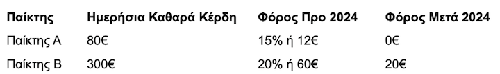 Η διαφορά για τους παίκτες είναι σημαντική: μικροί παίκτες προστατεύονται πλέον από φόρους, καθώς δεν επιβαρύνονται για ημερήσια καθαρά κέρδη έως 100€, ενώ οι μεγαλύτεροι έχουν σταθερότερη εικόνα για την καθαρή απόδοση των παιχνιδιών τους.