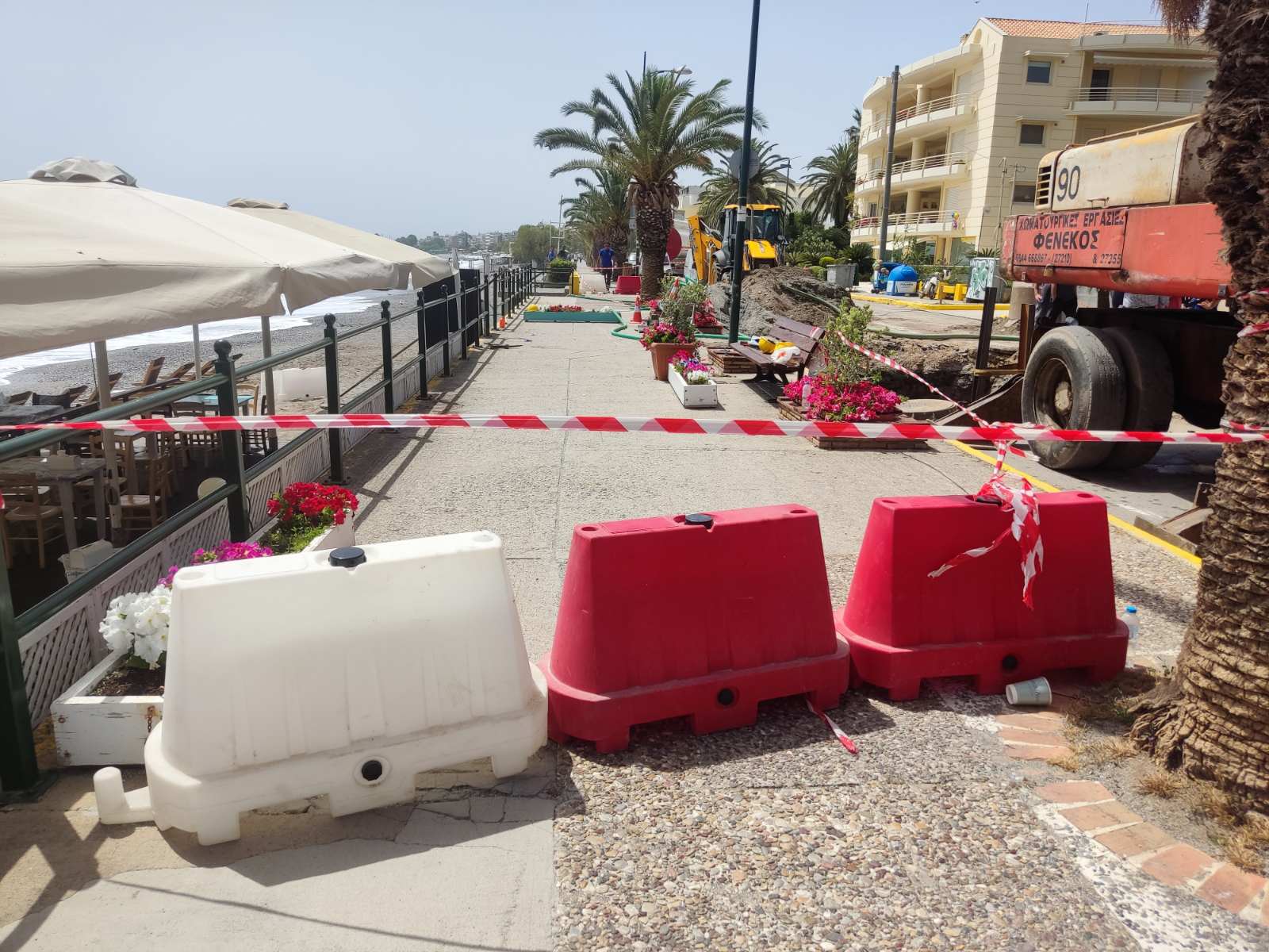 Λόγω της ζημιάς υποχώρησε το έδαφος και κατέρρευσε τμήμα της άκρης του πεζοδρομίου με δύο γλάστρες ενώ απειλείται κολόνα του δημοτικού φωτισμού. Για το λόγο αυτό έκλεισε το νότιο πεζοδρόμιο στο συγκεκριμένο σημείο και οι πεζοί πηγαίνουν από το απέναντι.