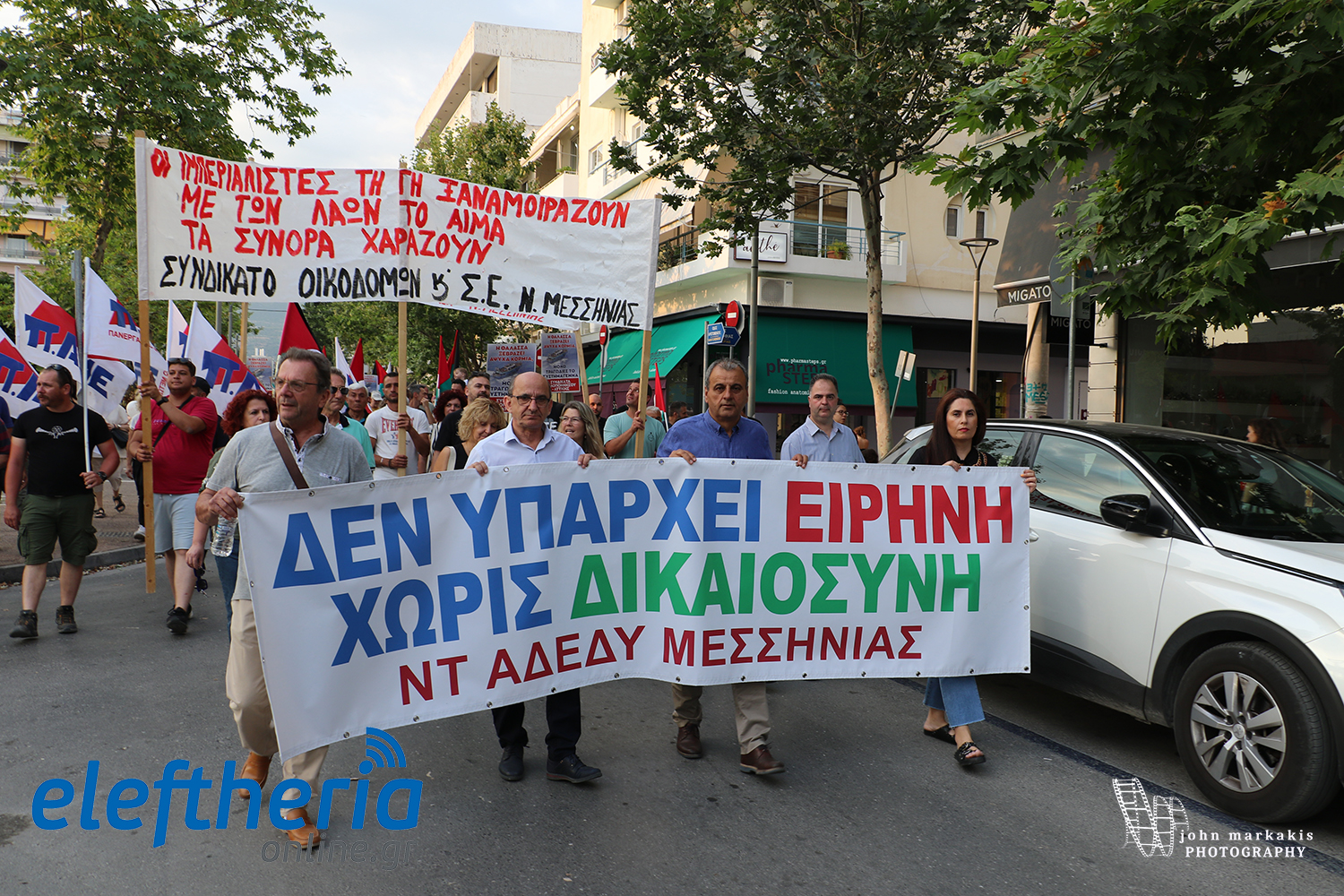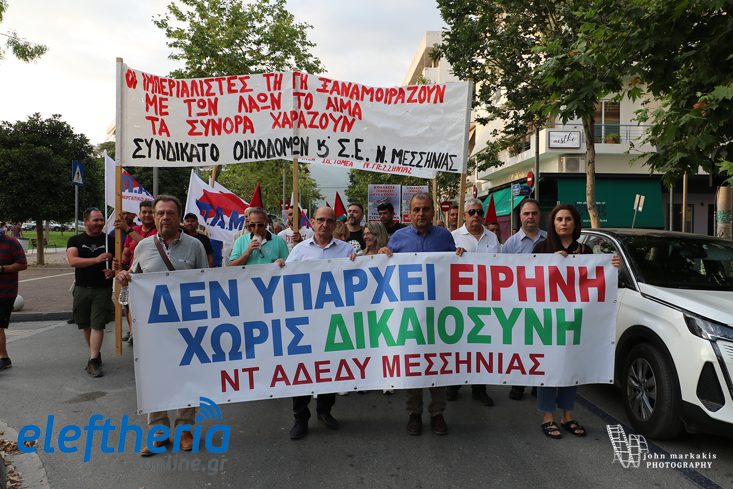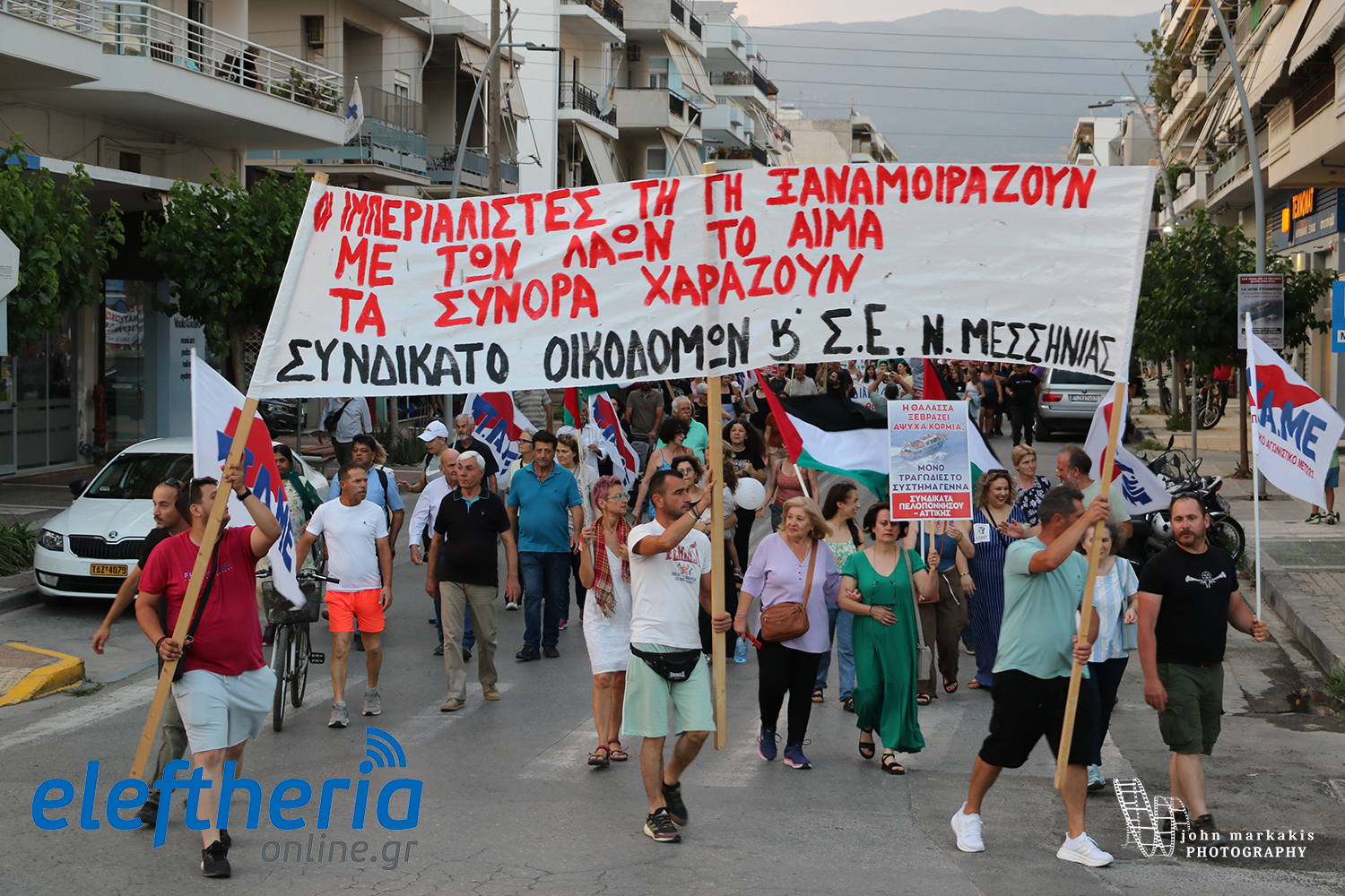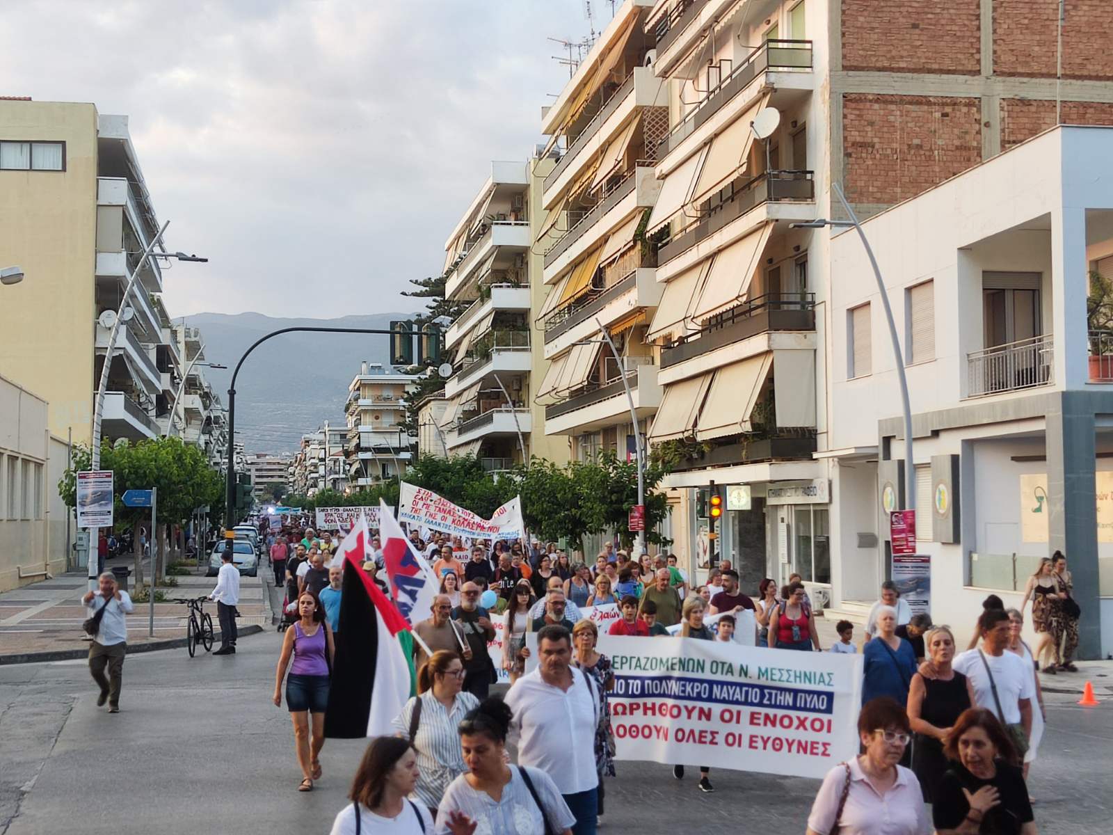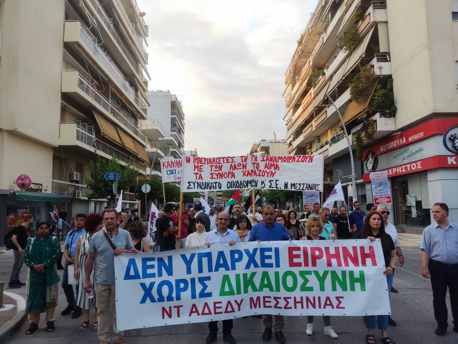 Ο πρόεδρος του Συνδικάτου Οικοδόμων και Συναφών Επαγγελμάτων Μεσσηνίας Παναγιώτης Καράμπελας παρατήρησε ότι “η συγκέντρωση στέλνει μήνυμα στην κυβέρνηση και σε όλες τις κυβερνήσεις της Ε.Ε. που έχουν προτεραιότητα τα κέρδη των λίγων «σκάστε τώρα, γέμισαν οι κάσες με νεκρούς». Μίλησε για βρώμικη και απάνθρωπη πολιτική του κέρδους κι επεσήμανε πως “το 2024 σημειώθηκαν οι περισσότερες ένοπλες συγκρούσεις στον πλανήτη από το 1946”. Εξαπέλυσε επίθεση στο “κράτος - δολοφόνο του Ισραήλ που το στηρίζουν οι ΗΠΑ και τα ευρωπαϊκά κράτη” και δήλωσε πως “είμαστε αλληλέγγυοι στον ηρωικό παλαιστινιακό λαό, είμαστε εδώ γιατί είμαστε άνθρωποι”.