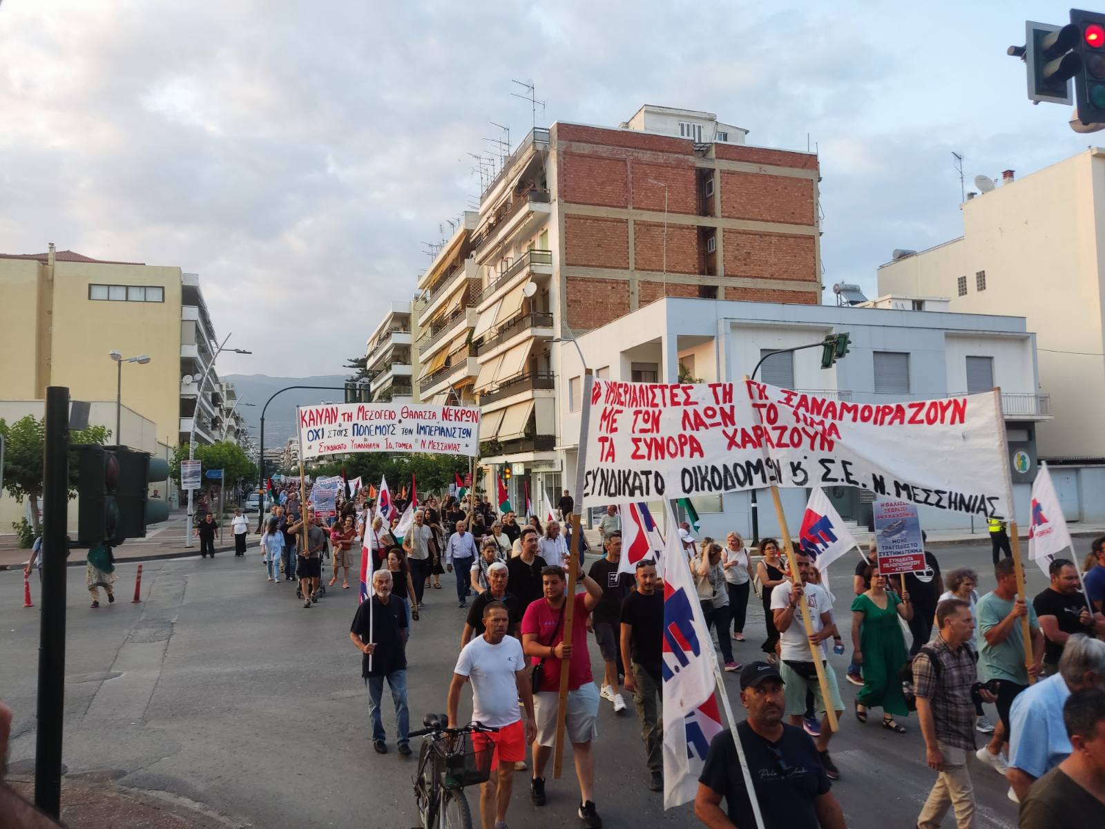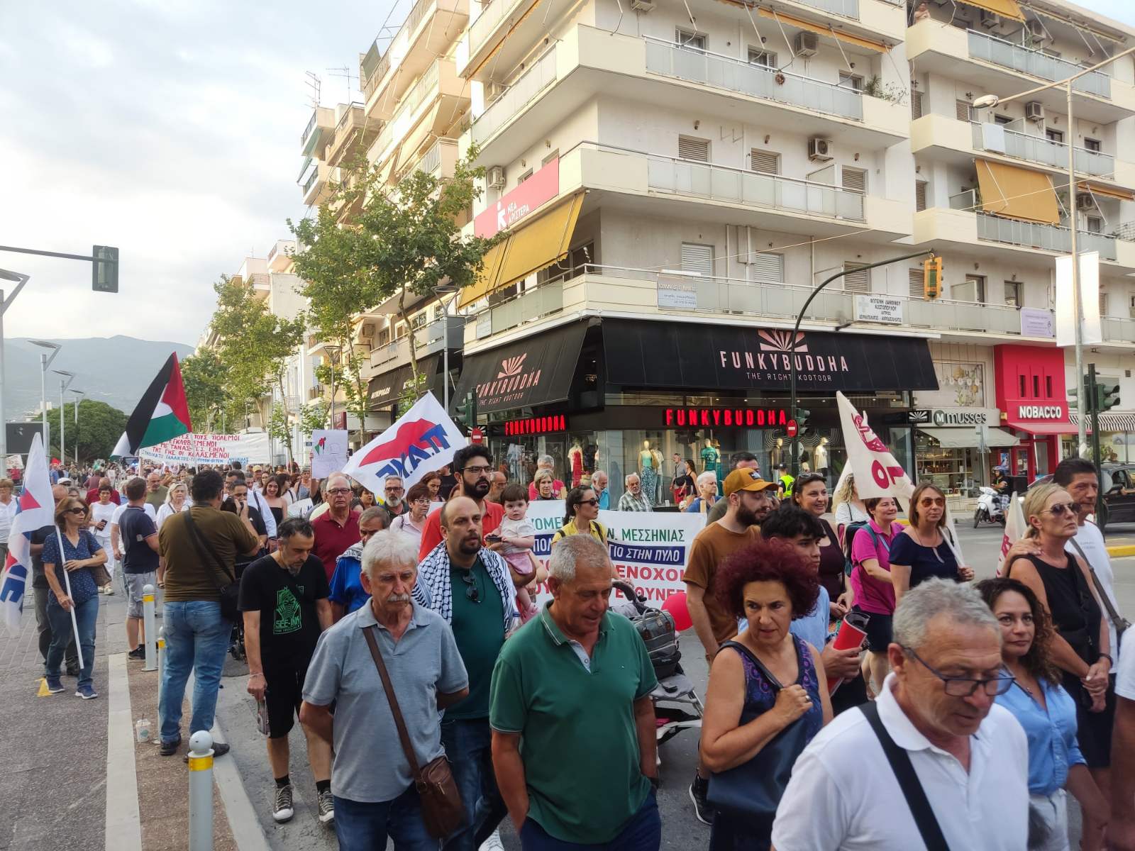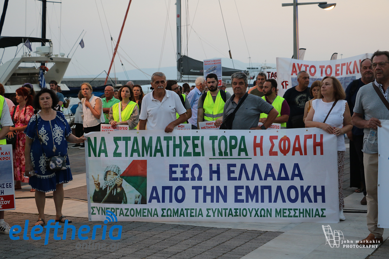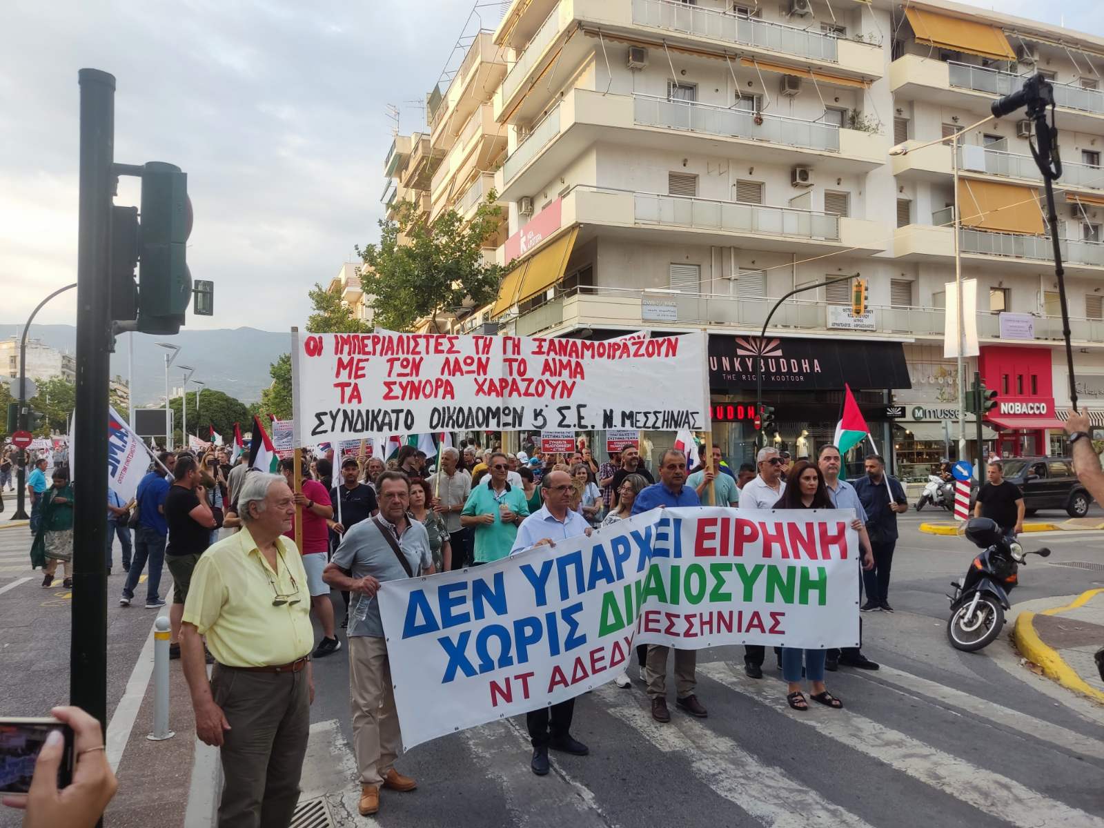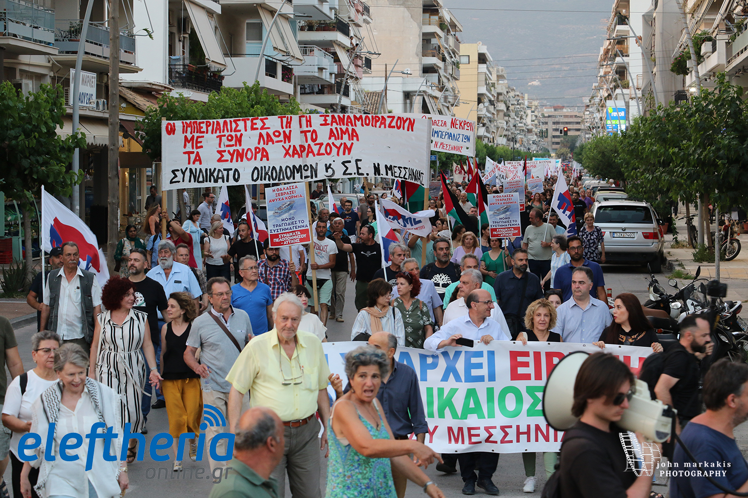 Ο πρόεδρος του Συνδικάτου Οικοδόμων και Συναφών Επαγγελμάτων Μεσσηνίας Παναγιώτης Καράμπελας παρατήρησε ότι “η συγκέντρωση στέλνει μήνυμα στην κυβέρνηση και σε όλες τις κυβερνήσεις της Ε.Ε. που έχουν προτεραιότητα τα κέρδη των λίγων «σκάστε τώρα, γέμισαν οι κάσες με νεκρούς». Μίλησε για βρώμικη και απάνθρωπη πολιτική του κέρδους κι επεσήμανε πως “το 2024 σημειώθηκαν οι περισσότερες ένοπλες συγκρούσεις στον πλανήτη από το 1946”. Εξαπέλυσε επίθεση στο “κράτος - δολοφόνο του Ισραήλ που το στηρίζουν οι ΗΠΑ και τα ευρωπαϊκά κράτη” και δήλωσε πως “είμαστε αλληλέγγυοι στον ηρωικό παλαιστινιακό λαό, είμαστε εδώ γιατί είμαστε άνθρωποι”.