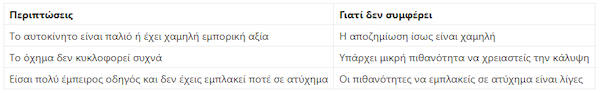 Υπάρχουν και περιπτώσεις που η μικτή ασφάλεια δεν αξίζει το επιπλέον κόστος. Συγκεντρώσαμε κάποιες από’ αυτές στον παρακάτω πίνακα: