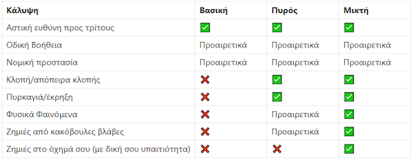 Ακολουθεί ένας πίνακας σύγκρισης καλύψεων των τριών βασικών προγραμμάτων ασφάλισης.