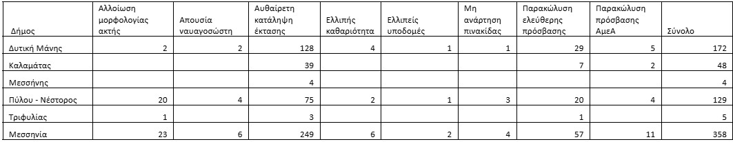 Η Μεσσηνία είναι στη 10η θέση της σχετικής πανελλήνιας λίστας ενώ στη πρώτη θέση βρίσκεται η Χαλκιδική με 2.443 καταγγελίες και ακολουθούν η Αττική με 1.048 καταγγελίες και οι Κυκλάδες με 817 καταγγελίες. Στη Μεσσηνία οι 172 καταγγελίες έχουν γίνει για παραλίες του Δήμου Δυτικής Μάνης, οι 129 για παραλίες του Δήμου Νέστορος , οι 48 για παραλίες του Δήμου Καλαμάτας, οι 5 για παραλίες του Δήμου Τριφυλίας και οι 4 του Δήμου Μεσσήνης.