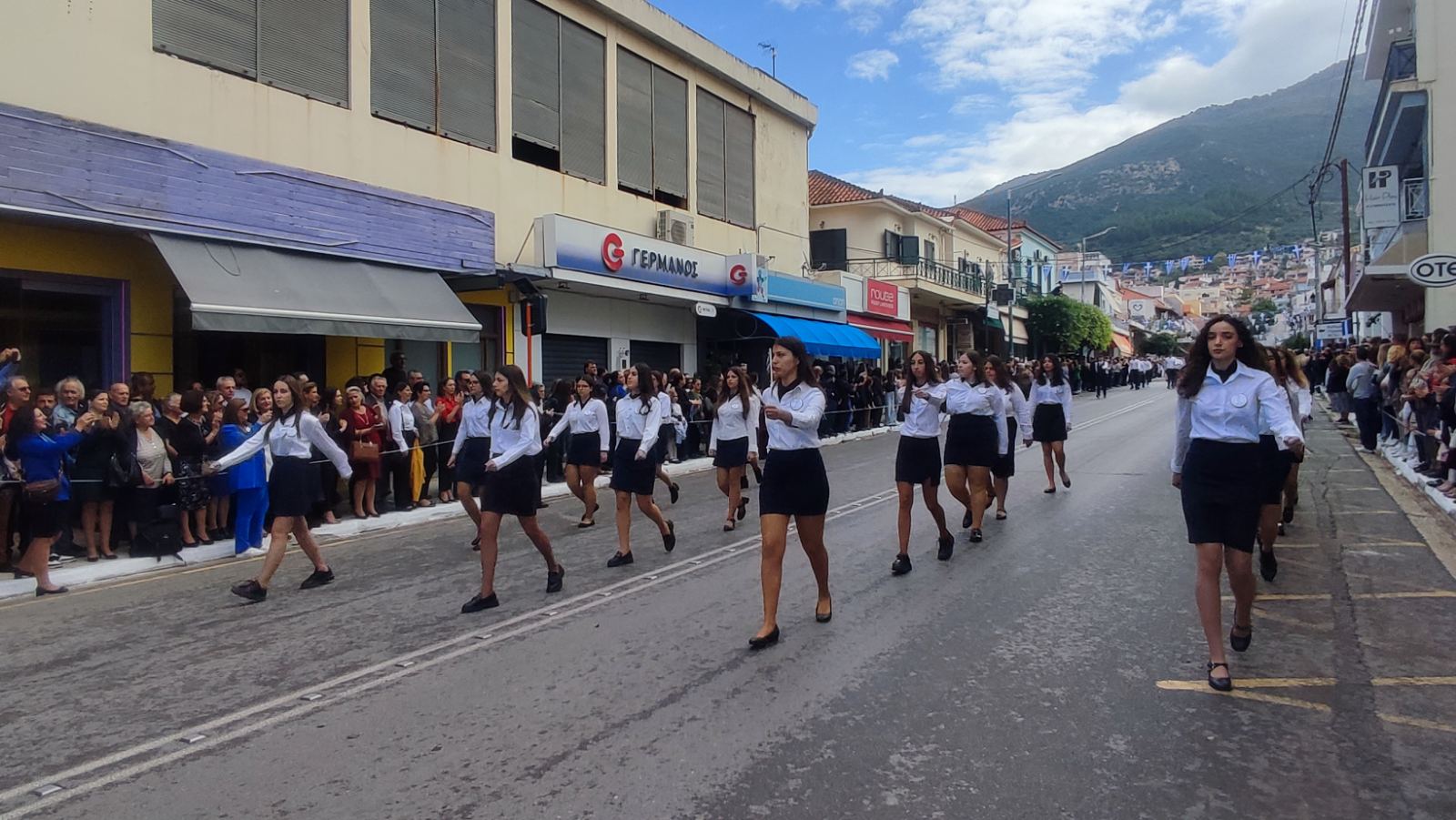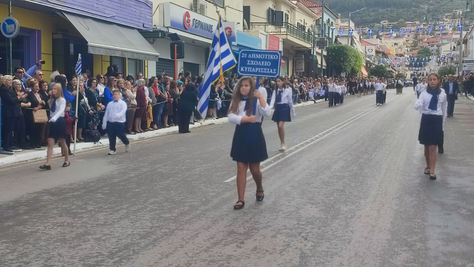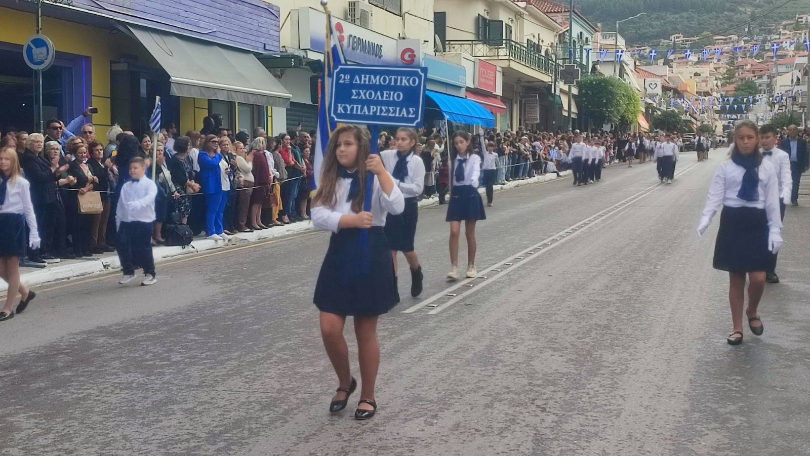 Ακολούθησε η μεγάλη μαθητική παρέλαση στην οδό Ελευθερίου Βενιζέλου παρουσία πλήθους κόσμου που χειροκρότησε με θέρμη τα παιδιά της πόλης. Οι εκδηλώσεις έκλεισαν με παράσταση παραδοσιακών χορών από το Μορφωτικό Εκπολιτιστικό Σύλλογο Κυπαρισσίας (ΜΕΣΚ) στην κεντρική πλατεία.