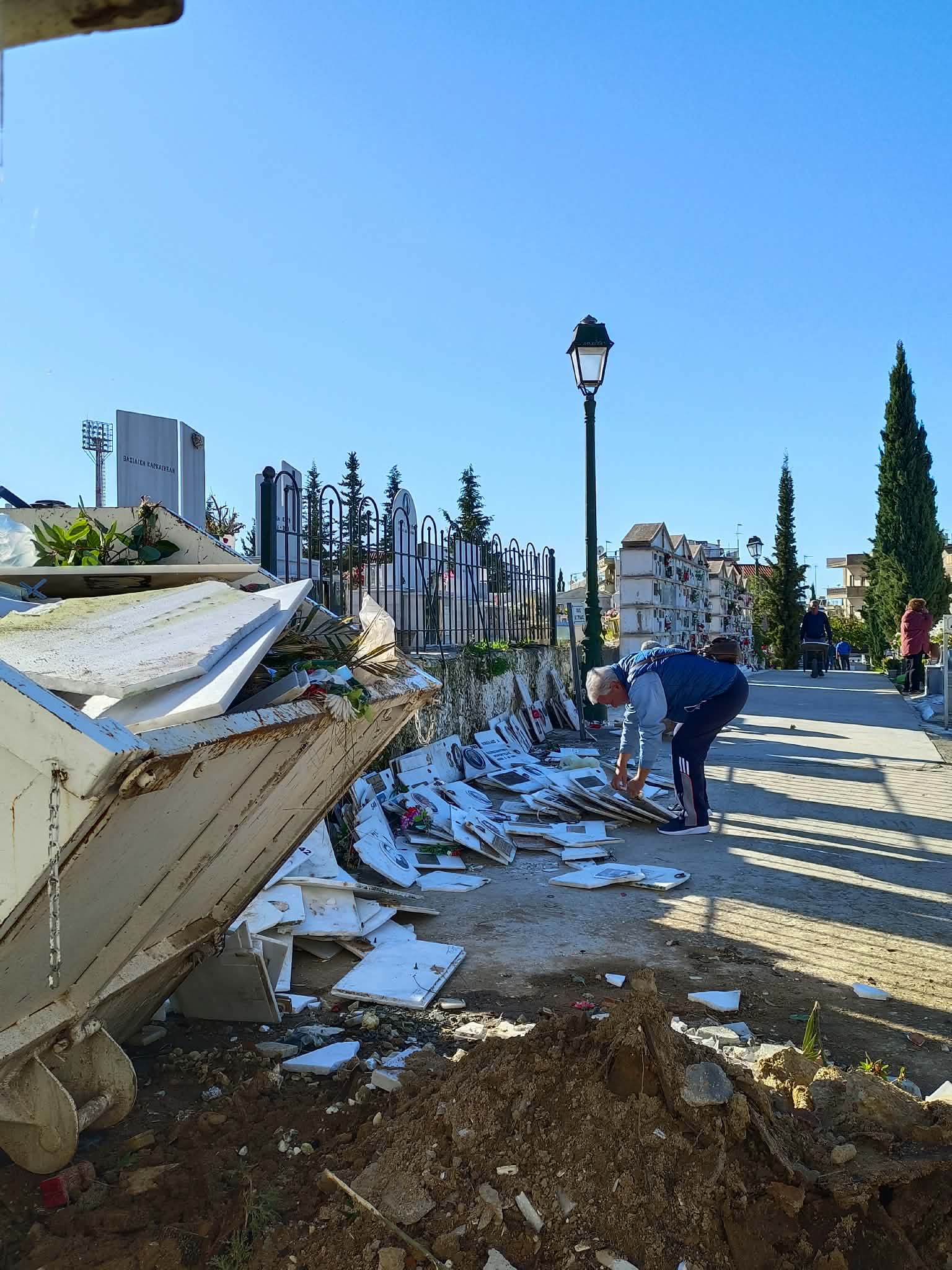 Ακόμα και χθες το πρωί, συγγενείς θανόντων έψαχναν με αγωνία να βρουν τις πεταμένες φωτογραφίες των δικών τους ανθρώπων και να ανακαλύψουν ποια είναι η θυρίδα με τα οστά του αγαπημένου τους προσώπου, καθώς σε αυτές που αντικαταστάθηκαν οι μαρμάρινες όψεις, είχαν μόνο αριθμό.