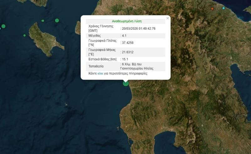 Συγκεκριμένα, σεισμός 4,1 βαθμών της κλίμακας Ρίχτερ, που χαρακτηρίζεται "ασθενής", καταγράφτηκε στις 03:49 στον θαλάσσιο χώρο ανοικτά της δυτικής Πελοποννήσου, 6 χιλιόμετρα νότια από την κοινότητα Ζαχάρω (περιφερειακή ενότητα Ηλείας), ή 192 χιλιόμετρα δυτικά-νοτιοδυτικά της πρωτεύουσας, ανακοίνωσε νωρίς το πρωί το Γεωδυναμικό Ινστιτούτο του Εθνικού Αστεροσκοπείου της Αθήνας.