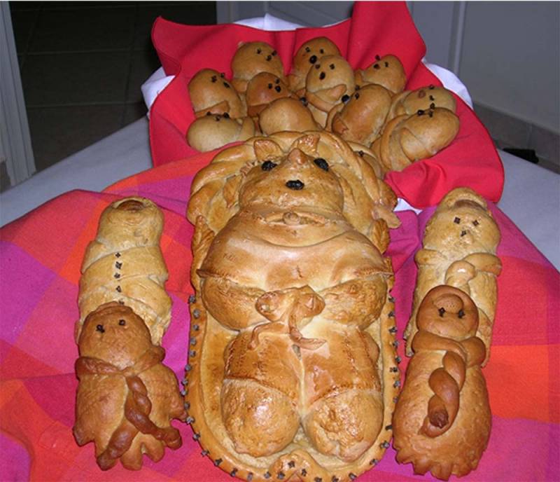 - Πλαταίνετε το κάθε κομμάτι, τοποθετείτε στη μέση λίγο μίγμα από την γέμιση και κλείνετε από πάνω τη ζύμη. Πλάθετε στενόμακρα φραντζολάκια και καρφώνετε γαρίφαλα στη θέση των ματιών. Φτιάχνετε ένα κορδόνι από ζύμη και τυλίγετε το φραντζολάκι σχηματίζοντας τα χέρια τα οποία σταυρώνετε πάνω από το σώμα.