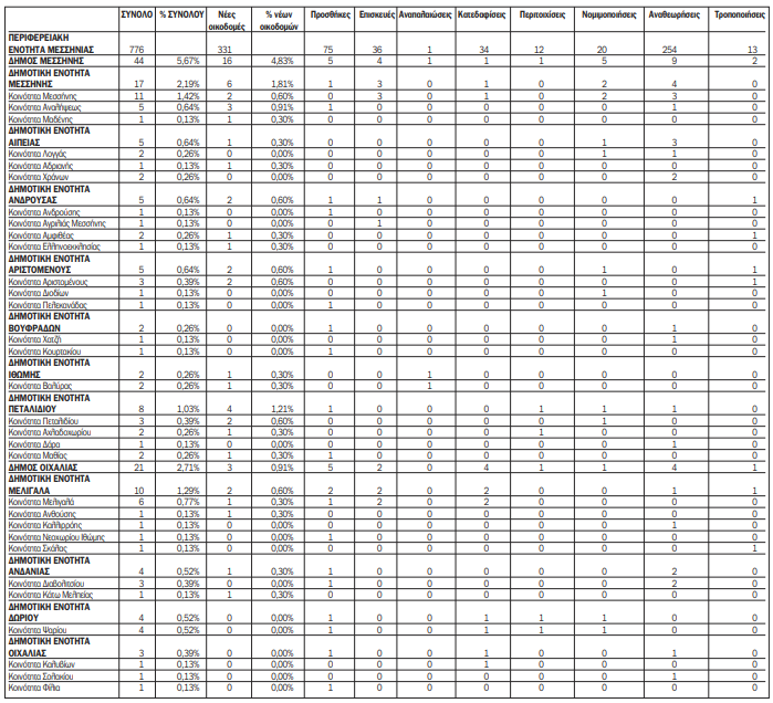 Τα στοιχεία της ΕΛΣΤΑΤ δείχνουν ότι από το σύνολο των 776 οικοδομικών αδειών στη Μεσσηνία, ο δήμος Μεσσήνης συγκεντρώνει 44 άδειες (5,67%) και ο δήμος Οιχαλίας μόλις 21 (2,71%).