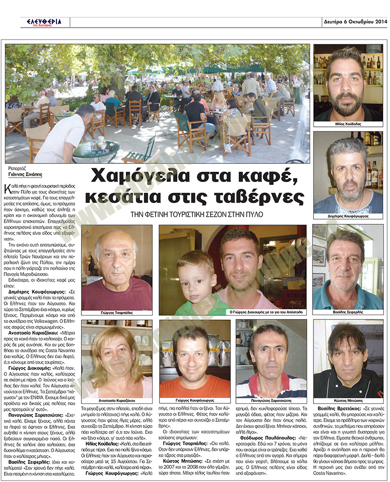 Βασίλης Σεφερλής: (έχει και καταλύματα) «Σαν χρονιά δεν πήγε καλά. Είναι πεσμένη η κίνηση στα καταλύματα. Το μαγαζί μας στην πλατεία, επειδή είναι μνημείο (ο πλάτανος) πήγε καλά. Ο Αύγουστος ήταν φέτος λίγες μέρες, αλλά συνεχίζει το Σεπτέμβριο. Η κίνηση τώρα πάει καλύτερα απ’ ό,τι τον Ιούνιο. Εχει και ξένο κόσμο, γι’ αυτό πάει καλά».