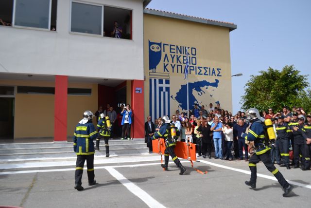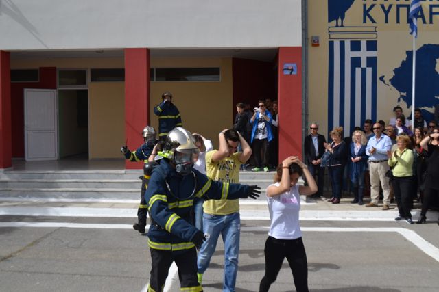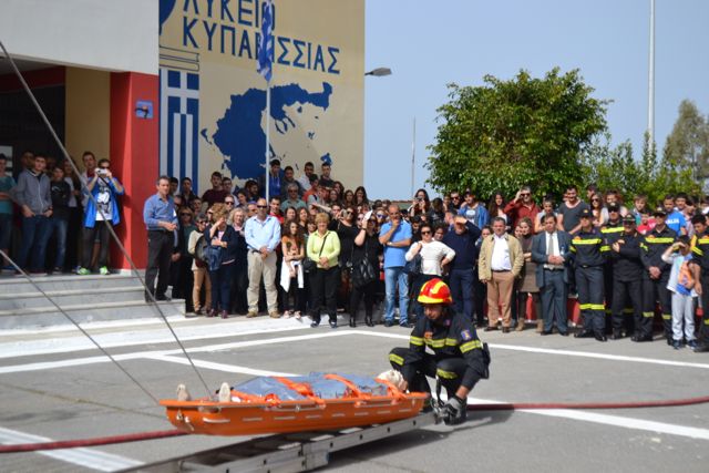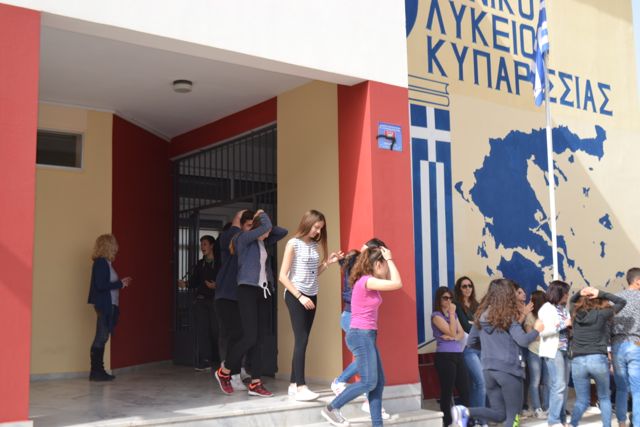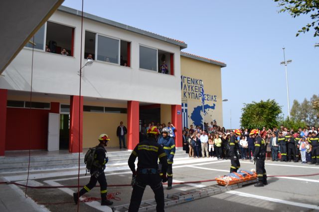 «Στο πλαίσιο της συνεχούς εκπαίδευσης της υπηρεσίας μας για αντιμετώπιση συμβάντων και κατόπιν πρωτοβουλίας του διευθυντή του Λυκείου Κυπαρισσίας διοργανώθηκε η άσκηση, η οποία προέβλεπε εκδήλωση σεισμού στο χώρο του Λυκείου με αποτέλεσμα την εκδήλωση φωτιάς, κατάρρευση της σκάλας που οδηγεί στον πρώτο όροφο και εγκλωβισμό μαθητών στο κτήριο.