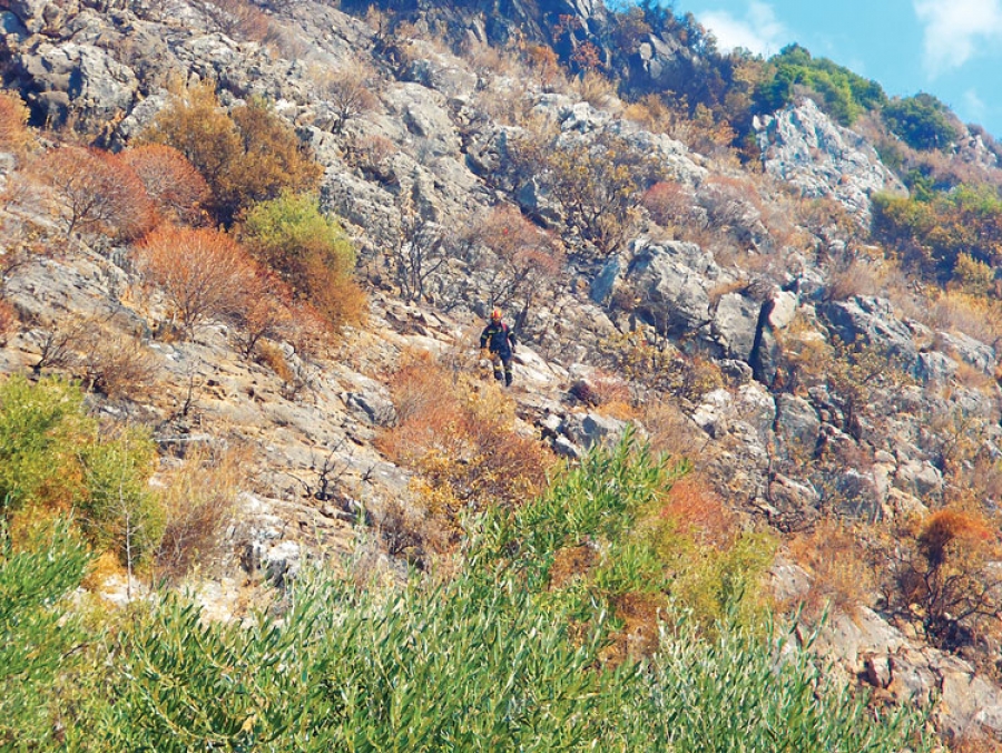 O καπνός, συνέπεια της πρόσφατης πυρκαγιάς στους πρόποδες του Καλαθιού, εμφανίστηκε κοντά στη χαράδρα και οι διασώστες πυροσβέστες χρειάστηκε να χρησιμοποιήσουν ορειβατικό εξοπλισμό. Στο σημείο έφτασαν ο πυραγός Θανάσης Κατσαφάδος και ο αρχιπυροσβέστης Λευτέρης Δημητρόπουλος, ενώ την υποστηρικτική ομάδα αποτελούσαν οι αρχιπυροσβέστες Παναγιώτης Παραγγίνης και Νίκος Κοτσόβολης.