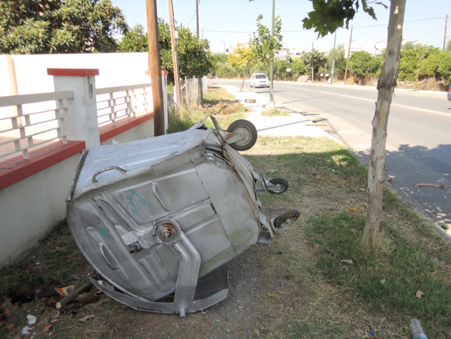 Τους κάδους ανακύκλωσης και σκουπιδιών παρέσυρε και αναποδογύρισε χθες στις 4.30 το πρωί, αυτοκίνητο που ξέφυγε από την πορεία του στην οδό Κρήτης, αμέσως μετά την Εθνικού Σταδίου, στο ρεύμα προς Βέργα. «Η σύγκρουση ήταν τόσο σφοδρή, που νομίσαμε πως ήταν σεισμός ή έκρηξη», μας επεσήμανε περίοικος. Ο κάδος των σκουπιδιών σταμάτησε πάνω στο πεζοδρόμιο, αρκετά μέτρα από τη θέση του και της ανακύκλωσης καβάλησε την περίφραξη και άδειασε τα ανακυκλώσιμα υλικά στο παρακείμενο κτήμα. Οι επιβάτες του αυτοκινήτου ήταν, πάντως, τυχεροί, καθώς στο αστυνομικό δελτίο συμβάντων καταχωρίσθηκε ως τροχαίο με υλικές ζημιές.