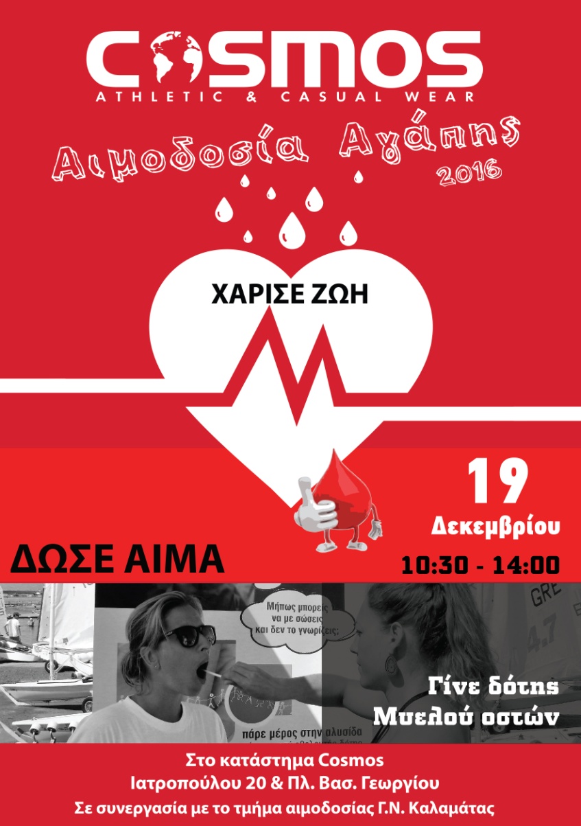 Σε συνεργασία, με το τμήμα Αιμοδοσίας του Γενικού Νοσοκομείου Καλαμάτας η εκδήλωση θα πραγματοποιηθεί την Δευτέρα 19 Δεκεμβρίου από τις 10:30 π.μ. εντός του νέου καταστήματος COSMOS στην κεντρική Πλατεία Καλαμάτας.