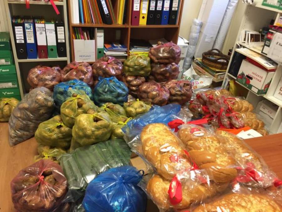 Συγκεκριμένα ο δήμος μοίρασε 287 κιλά κρέας, 438 κιλά πατάτες, 116 κιλά φέτα, 750 αυγά, 130 τσουρέκια, 100 κιλά κρασί, 15 πακέτα κριθαράκι, 15 τεμάχια τοματοχυμό, 300 τεμάχια αγγούρια - και ευχαρίστησε τις επιχειρήσεις που συνέδραμαν.