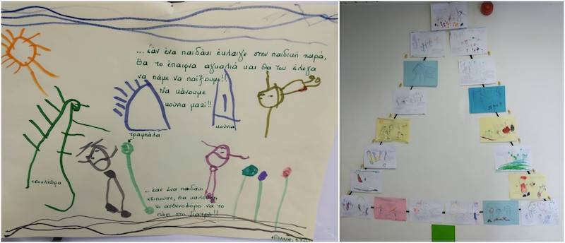 “...Εάν ένα παιδάκι έκλαιγε στην παιδική χαρά, θα το έπαιρνα αγκαλιά και θα του έλεγα να πάμε να παίξουμε!”, γράφει στη ζωγραφιά ενός νηπίου, που όπως και στα άλλα έργα που έχουν φιλοτεχνηθεί σε σχολεία της πόλης (υπάρχουν και έργα που δημιουργήθηκαν στο 7ο Γυμνάσιο από καθηγητές στο πλαίσιο σεμιναρίου), τα παιδιά θέλουν να περάσουν σε αυτόν που στέκεται για λίγο στο διάδρομο και τα διαβάζει, αλλά και στην υπηρεσία όπου απευθύνονται, το δικό τους μήνυμα για το τι σημαίνει προστασία των δικαιωμάτων του παιδιού.