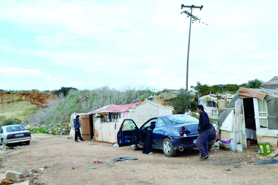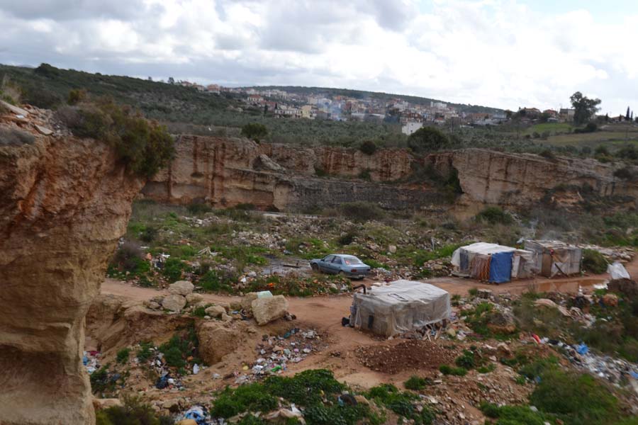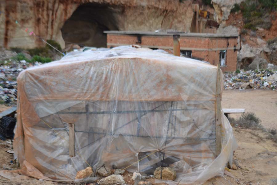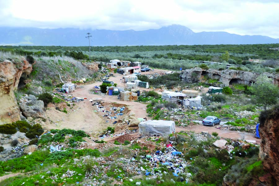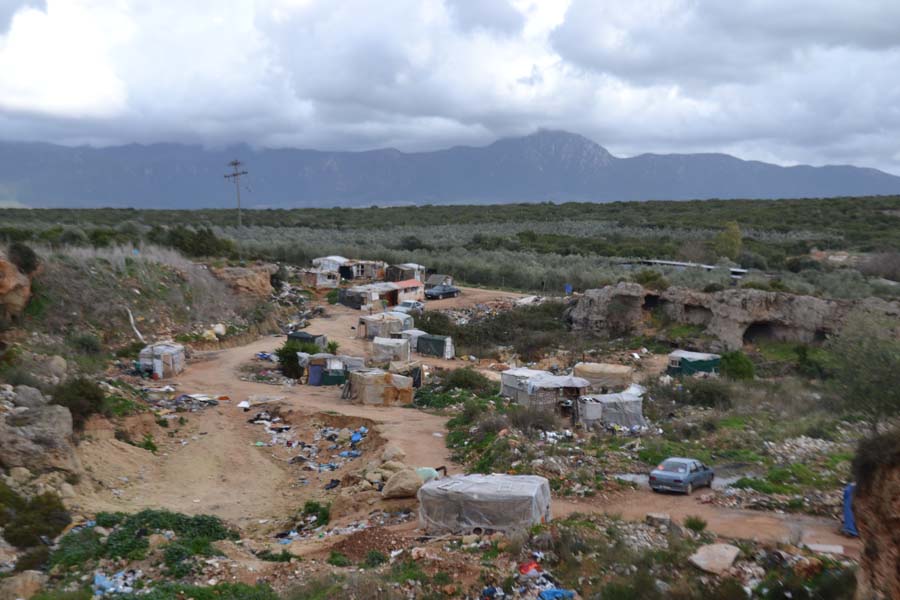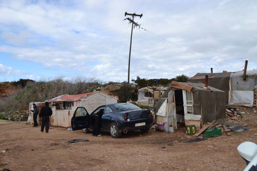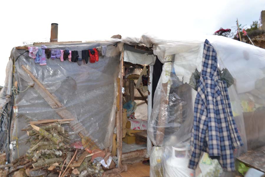 Απ' άκρη σ' άκρη ο χώρος είναι γεμάτος σκουπίδια και μπάζα και φαίνεται ότι αποτελούσε ένα καλό μέρος για να ξεφορτώνονται κάποιοι τα απορρίμματά τους, χωρίς να κάνουν τον κόπο να πάνε λίγο πιο πάνω, όπου βρίσκεται η χωματερή της πόλης. Μέσα σε αυτό το άθλιο σκηνικό έχουν βρει τον κατάλληλο χώρο για να εγκατασταθούν περισσότερα από 40 άτομα αυτή την εποχή, αριθμός που ξεπερνούσε τους 150 την περίοδο που η ελαιοσυγκομιδή ήταν σε πλήρη εξέλιξη και η περιοχή είχε ανάγκη από εργατικά χέρια. Μετρήσαμε περισσότερες από 30 τέτοιες μικρές παράγκες οι οποίες είναι φτιαγμένες από ξύλα και πλαστικό, ενώ με αυτοσχέδιες σόμπες που έχουν γίνει από άδειους τενεκέδες προσπαθούν να ζεσταθούν αλλά και να εξασφαλίσουν έναν τρόπο να μαγειρέψουν. Σε μια γωνιά ένας χώρος στρωμένος με παλιές κουβέρτες και στην καλύτερη περίπτωση κάποιο παλιό στρώμα που χρησιμεύει ως κρεβάτι, ενώ σε κάποια καρφιά στα ξύλα κρεμούν ό,τι τους ανήκει, όπως ρούχα και τρόφιμα.