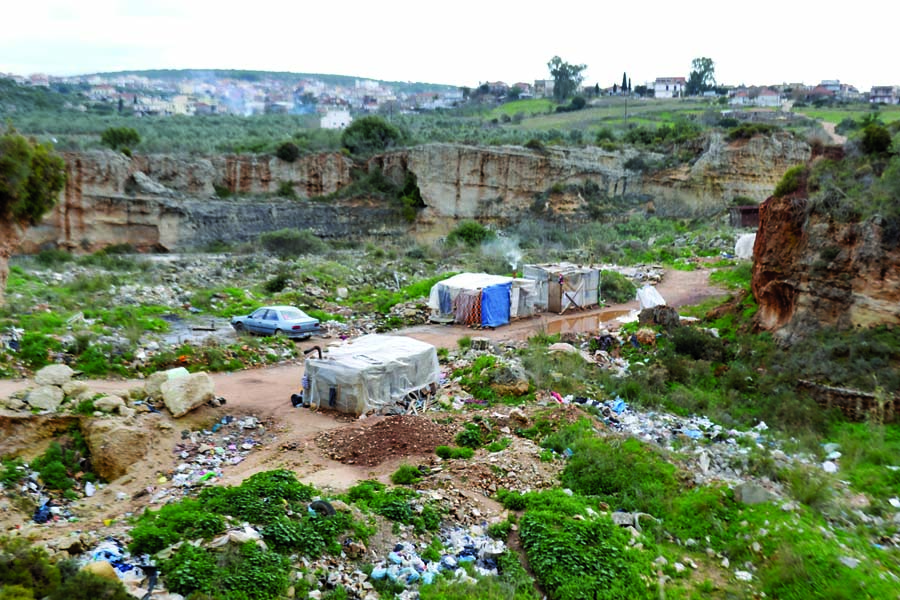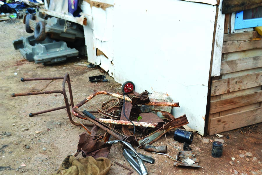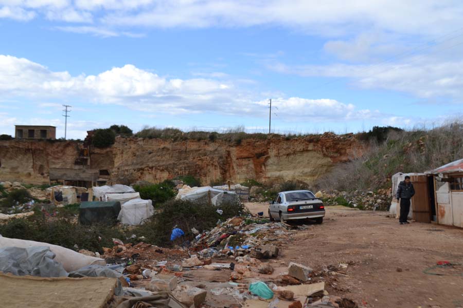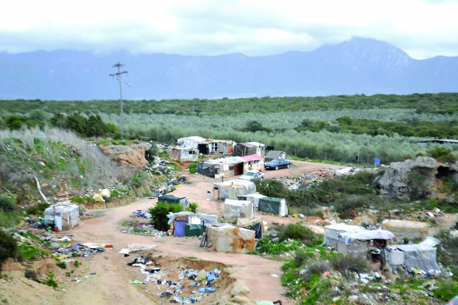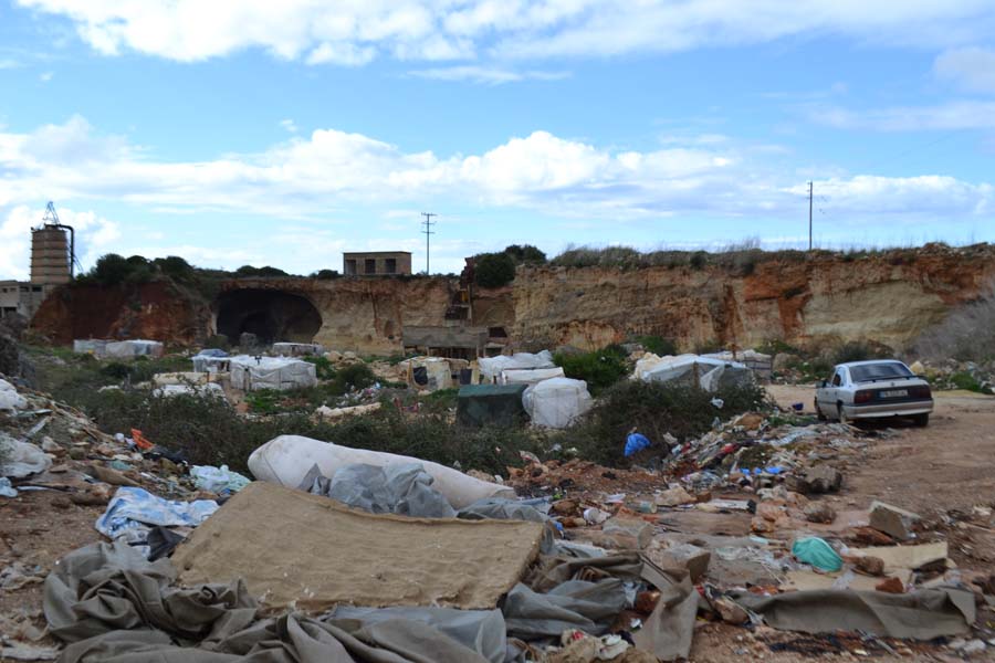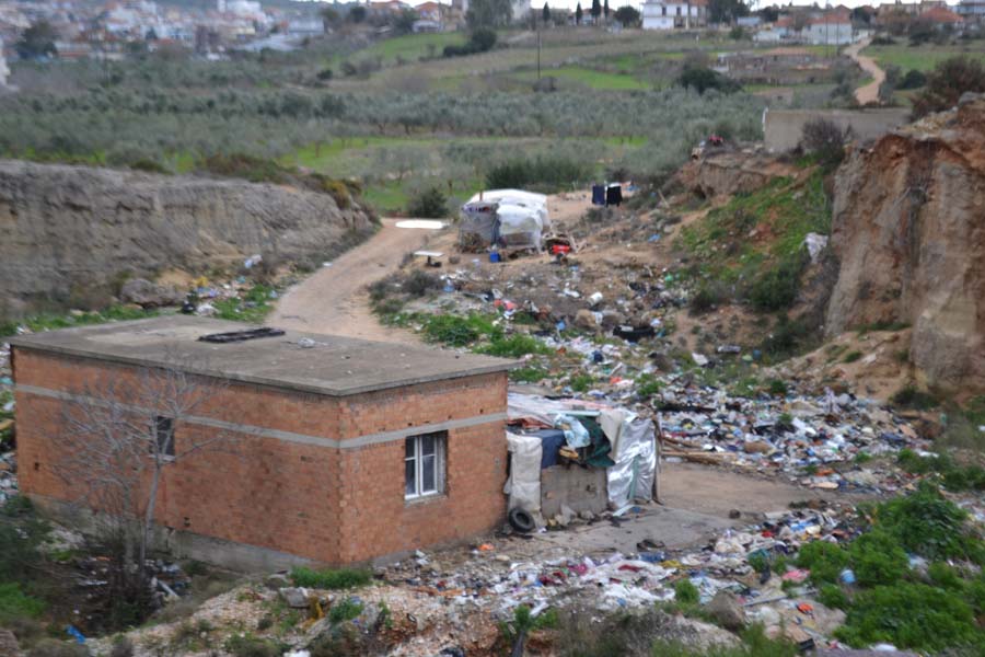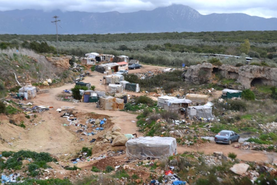 Απ' άκρη σ' άκρη ο χώρος είναι γεμάτος σκουπίδια και μπάζα και φαίνεται ότι αποτελούσε ένα καλό μέρος για να ξεφορτώνονται κάποιοι τα απορρίμματά τους, χωρίς να κάνουν τον κόπο να πάνε λίγο πιο πάνω, όπου βρίσκεται η χωματερή της πόλης. Μέσα σε αυτό το άθλιο σκηνικό έχουν βρει τον κατάλληλο χώρο για να εγκατασταθούν περισσότερα από 40 άτομα αυτή την εποχή, αριθμός που ξεπερνούσε τους 150 την περίοδο που η ελαιοσυγκομιδή ήταν σε πλήρη εξέλιξη και η περιοχή είχε ανάγκη από εργατικά χέρια. Μετρήσαμε περισσότερες από 30 τέτοιες μικρές παράγκες οι οποίες είναι φτιαγμένες από ξύλα και πλαστικό, ενώ με αυτοσχέδιες σόμπες που έχουν γίνει από άδειους τενεκέδες προσπαθούν να ζεσταθούν αλλά και να εξασφαλίσουν έναν τρόπο να μαγειρέψουν. Σε μια γωνιά ένας χώρος στρωμένος με παλιές κουβέρτες και στην καλύτερη περίπτωση κάποιο παλιό στρώμα που χρησιμεύει ως κρεβάτι, ενώ σε κάποια καρφιά στα ξύλα κρεμούν ό,τι τους ανήκει, όπως ρούχα και τρόφιμα.