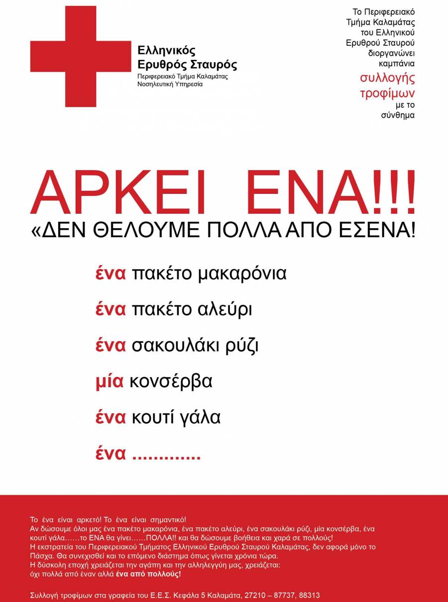 Οπως αναφέρεται σε σχετική ανακοίνωση: "Αν δώσουμε όλοι μας ένα πακέτο μακαρόνια, ένα πακέτο αλεύρι, ένα σακουλάκι ρύζι, μία κονσέρβα, ένα κουτί γάλα... το ένα θα γίνει πολλά και θα δώσουμε βοήθεια και χαρά σε πολλούς". Σημειώνεται δε πως η εκστρατεία του Περιφερειακού Τμήματος Καλαμάτας του ΕΕΣ δεν αφορά μόνο το Πάσχα, αλλά θα συνεχισθεί και το επόμενο διάστημα όπως γίνεται εδώ και χρόνια.