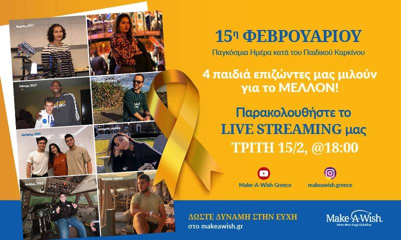 Το 2021 το Make-A-Wish Ελλάδος προστάτευσε τις οικογένειες και τα παιδιά από τον ιό, χωρίς να τους στερήσει την εκπλήρωση των ευχών τους και την ελπίδα ακολουθώντας πιστά τις οδηγίες των γιατρών. Σήμερα γιορτάζει το θάρρος, τον αγώνα και το μέλλον των παιδιών που παλεύουν και μας προσκαλεί να παρακολουθήσουμε την εξέλιξη της υγείας και της ζωής τεσσάρων παιδιών, ενώ εκείνα παράλληλα θα μεταφέρουν το αισιόδοξο μήνυμα της επιβίωσης από τον καρκίνο. Η Γεωργία, η Κατερίνα, ο Άγγελος και ο Γιάννης έχουν ενηλικιωθεί, έχουν ακολουθήσει ιατρικά επαγγέλματα και έχουν παραμείνει εθελοντές του Οργανισμού. Ο καθένας τους έχει μία μοναδική ιστορία να μοιραστεί σχετικά με την επίδραση της ευχής στη ζωή του και αυτό θα συμβεί μέσα από ένα μοναδικό live streaming στο Instagram του Make-A-Wish Ελλάδος σήμερα, στις 6 μ.μ. Τη συζήτηση θα συντονίσει ο επιστημονικός σύμβουλος του Οργανισμού και διευθυντής του Τμήματος Παιδιατρικής Αιματολογίας - Ογκολογίας του ΕΛΠΙΔΑ, δρ. Βασίλειος Παπαδάκης. Από το live streaming δεν θα λείψουν και οι εθελοντικές εμπειρίες ανθρώπων που έχουν βιώσει τη θεραπευτική δύναμη της εκπλήρωσης μίας ευχής.