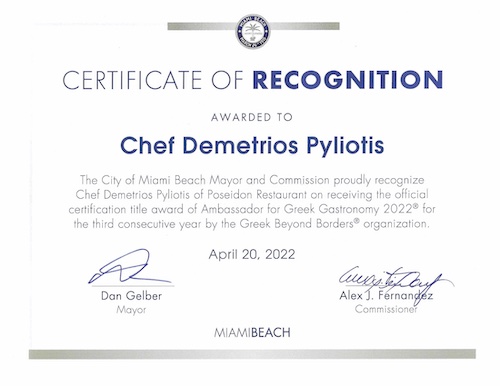 Η διάκριση δόθηκε στον σεφ ως ένδειξη αναγνώρισης επιτυχίας και καταξίωσης στον τομέα του, ταυτόχρονα με άλλα σημαίνοντα πρόσωπα του Miami για το 2022. Η τελετή έγινε στο Δημαρχείο και παρών ήταν και ο αντιδήμαρχος Alex Fernandez. Ο κ. Fernandez σχολίασε μάλιστα στην ομιλία του πως με την πορεία του ο Δημήτρης Πυλιώτης έχει προσφέρει στην αναβάθμιση και την προώθηση της περιοχής, μέσα από την δεκαετή παρουσία του στην γαστρονομία. Αναφέρθηκε στις επιτυχίες του σεφ και στη συμμετοχή του στην εκπομπή του “Foodnetwork”. Μάλιστα εξιστόρησε μια προσωπική του ανάμνηση, όταν σε κάποιο ταξίδι του στο Περού, ο διευθυντής της υποδοχής του συγκροτήματος που έμενε, τον ρώτησε από πού ερχόταν, εκείνος είπε πως ζει στο Miami. Η απάντηση που έλαβε ήταν συγκινητική, καθώς ο περουβιανός είχε επισκεφτεί την πόλη και τόνισε ότι έχει εξαιρετικά εστιατόρια. Συγκεκριμένα, είχε γευματίσει στο “Poseidon”!