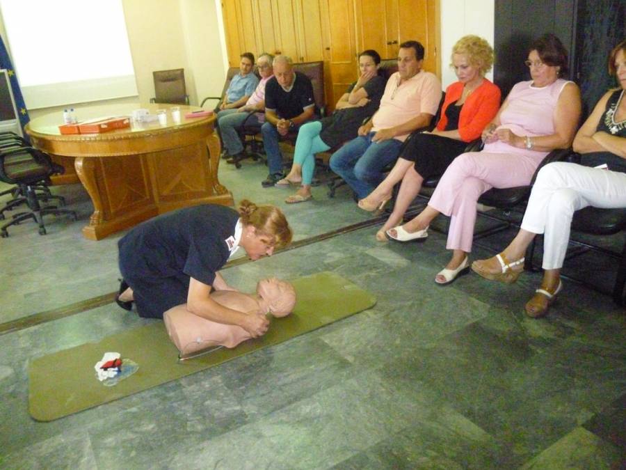 Η νοσηλεύτρια του τμήματος Ντίνα Δαμηλάτη επεσήμανε ότι είναι πολύτιμη η γνώση των πρώτων βοηθειών. Παρατήρησε πως το θύμα πρέπει να μείνει ακίνητο, να αποφεύγουμε τις περιττές κινήσεις, να το ενθαρρύνουμε και σημείωσε ότι η ψυχραιμία είναι τόσο σημαντική όσο και η γνώση. Στη συνέχεια έδειξε στους παριστάμενους υπαλλήλους σε κούκλα πώς αντιμετωπίζονται οι λιποθυμίες, πώς γίνεται το άνοιγμα του αεραγωγού και η τεχνητή αναπνοή.