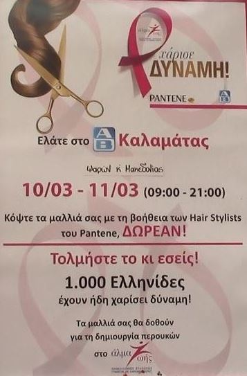 Και τις δύο ημέρες, από τις 9 το πρωί μέχρι τις 9 το βράδυ, μπροστά από το ΑΒ Βασιλόπουλος, στη συμβολή των οδών Μακεδονίας και Ψαρών, τo van θα περιμένει όσες γυναίκες αποφασίσουν να προσφέρουν μερικά εκατοστά από τα μαλλιά τους, για να χαρίσουν δύναμη σε γυναίκες που δοκιμάζονται από τον καρκίνο και βρίσκονται στο στάδιο της χημειοθεραπείας. Η ομάδα hair stylists της Pantene θα είναι εκεί για να μας ενημερώσει, να δεχθεί την προσφορά μας και να φροντίσει για ένα όμορφο αποτέλεσμα στα μαλλιά μας.