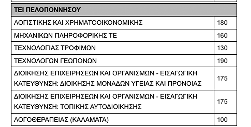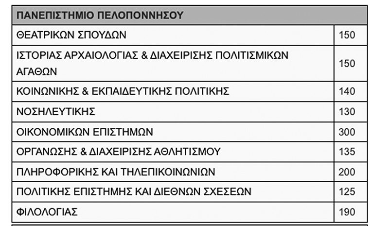 Συγκεκριμένα στις πανεπιστημιακές σχολές της Καλαμάτας θα εισαχθούν 340 φοιτητές και στα τμήματα ΤΕΙ 950 σπουδαστές. Συνολικά στο Πανεπιστήμιο Πελοποννήσου θα εισαχθούν 1.520 φοιτητές και στο ΤΕΙ 1.110 σπουδαστές.