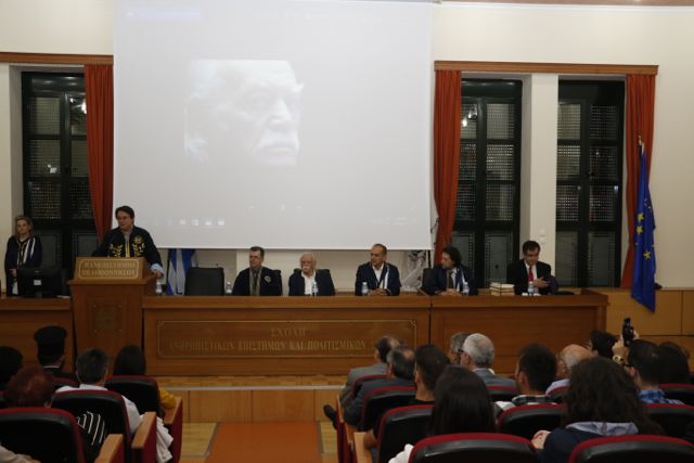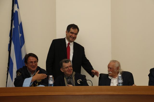 Είχε προηγηθεί μια σειρά χαιρετισμών από τον κοσμήτορα της Σχολής Ανθρωπιστικών Επιστημών και Πολιτισμικών Σπουδών, καθηγητή Αλέξιο Σαββίδη, τον πρόεδρο του Τμήματος Ιστορίας, Αρχαιολογίας και Διαχείρισης Πολιτισμικών Αγαθών, αναπληρωτή καθηγητή Νικόλαο Ζαχαριά και τον πρόεδρο του Τμήματος Φιλολογίας, αναπληρωτή καθηγητή Βασίλη Κωνσταντινόπουλο. Ιδιαίτερη μνεία έκαναν όλοι τους στην αντιστασιακή δράση του τιμωμένου και στην πράξη του, μαζί με τον Απόστολο Σάντα, να κατεβάσει την γερμανική σημαία από τον ιερό βράχο της Ακρόπολης, στις 30 προς 31 Μαΐου του 1941, μόλις 19 χρόνων τότε.