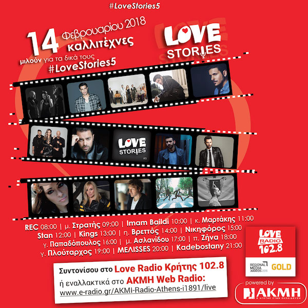 «Love Stories 5»…. με τους (με σειρά μετάδοσης): REC, M. Στρατή, Imam Baildi, Κώστα Μαρτάκη, STAN, Kings, Η. Βρεττό, Νικηφόρο, Γ. Παπαδόπουλο, Μ. Ασλανίδου, Π. Ζήνα, Γ. Πλούταρχο, MELISSES, Kadebostany.