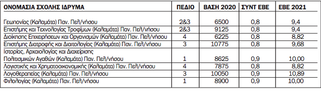 Ειδικότερα για τα τμήματα των σχολών του Πανεπιστημίου Πελοποννήσου στην Καλαμάτα οι βάσεις εισαγωγής αναμένεται να κυμανθούν από 8,82 έως 10,89.