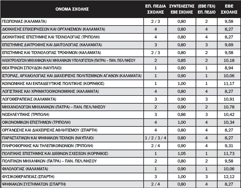 Οι βάσεις στα τμήματα του Πανεπιστημίου Πελοποννήσου διαμορφώνονται ως εξής: