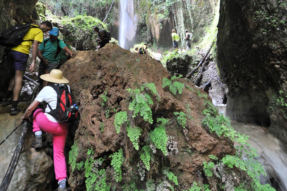 Η δεύτερη παράκαμψη επρόκειτο για μια αποκάλυψη. Μετά από αρκετή κατάβαση μέσα σε οργιαστική βλάστηση βρεθήκαμε καταπρόσωπο με μια πανύψηλη υδάτινη κουρτίνα που ξεχυνόταν από πολλά μέτρα πιο ψηλά από εμάς μέσα σε ένα στενό κοίλωμα του φαραγγιού. Ακριβώς δίπλα του στη βάση αυτού του καταρράκτη υπήρχε ένα σπηλαιώδες άνοιγμα. Οσοι περάσαμε εκεί, μετά το αναπόφευκτο ντους, ανακαλύψαμε ένα δεύτερο κρυμμένο καταρράκτη να χύνεται μέσα στη σπηλιά παράλληλα με τον προηγούμενο.