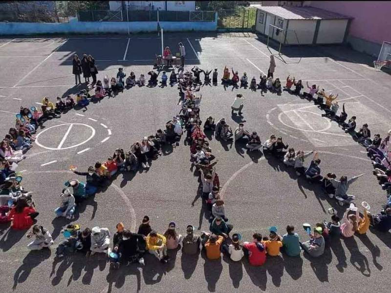 Σχημάτισαν στο προαύλιο του σχολείου με τα σώματά τους το σύμβολο της ειρήνης θέλοντας με τον δικό τους τρόπο να δείξουν, ότι τάσσονται κατά κάθε πολεμικής επιχείρησης, όπως αυτή που βιώνει η Ουκρανία μετά την ρωσική εισβολή.