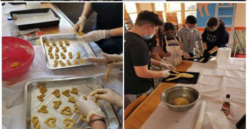 Το σχολείο για μια ακόμη φορά άνοιξε τις πόρτες του στα μέλη του Συλλόγου Γονέων και Κηδεμόνων και έτσι τρεις μητέρες, η Σοφία Μαυροπούλου, η Κλοντιάνα Μπάλα και η Αρτεμις Φραγγέα ήρθαν πρωί πρωί με σκεύη μαγειρικής, ολόφρεσκα υλικά κι έπιασαν δουλειά. Μαζί τους, 3 ομάδες μαθητών ακολούθησαν τις οδηγίες για να παρασκευάσουν πασχαλιάτικες νοστιμιές.